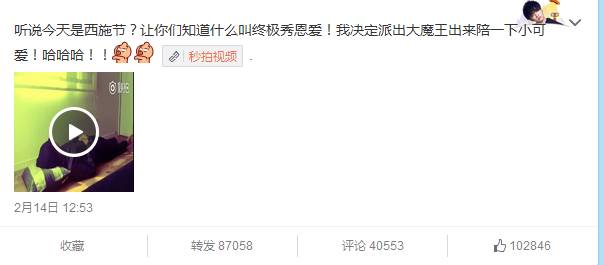 邓紫琪一周后才再发微博,在情人节的时候,貌似心情很好