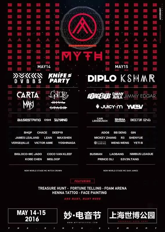 首届【MYTH妙大型户外电音节】将于2016年5月14至15日在上海世博园举行! 汇聚来自15个国家的50余组知名DJ,MYTH电音节将为中国电音迷们带来最具视觉与听觉冲击力的强力触电体验~