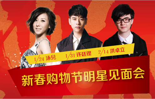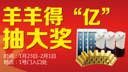 新春购物节明星见面会 1月24日 20:00 泳儿 1月31日 14:00 许廷铿 2月14日 20:00 洪卓立 【地点】1号门外广场舞台 羊羊得“亿”抽大奖 【时间】1月23日-2月1日 【地点】1号门入口处 全场购物满68元即可参与抽奖,有机会赢取羊金条、ipadmini等惊喜大奖! 万达百货1元起减70% 万达影城200元超级大礼包 情人节游戏送金币 永辉超市年货大团购 “熊出没”欢乐大巡游 【时间】1月25日10:00-21:00 五场 【地点】室内外步行街 憨厚可爱、力大无穷的熊大熊二两兄弟、奸诈狡猾的光头强,本周末东城万达欢乐来袭!