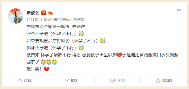 最近二姐张歆艺因为牙齿问题发了这个微博: