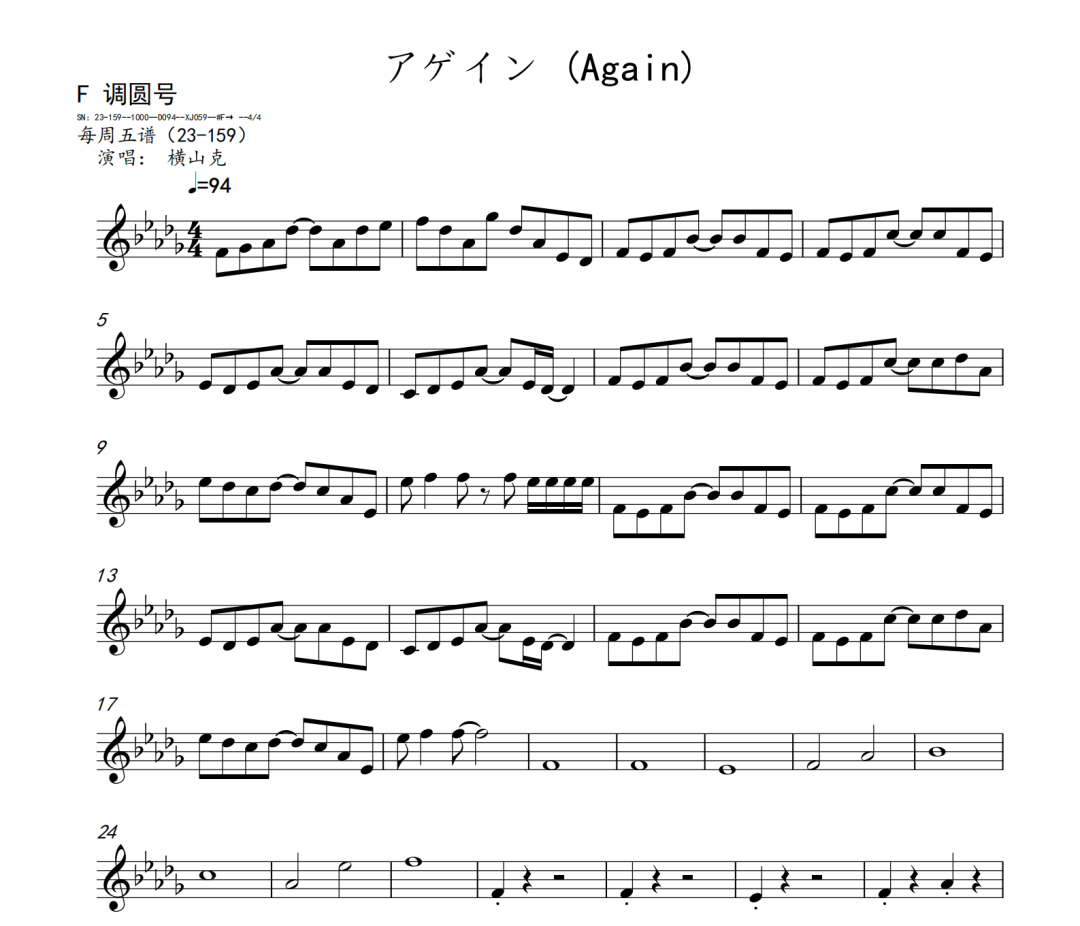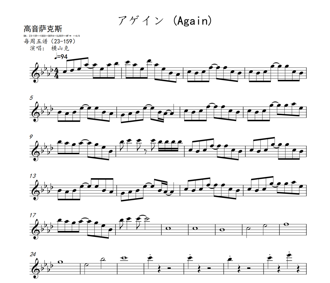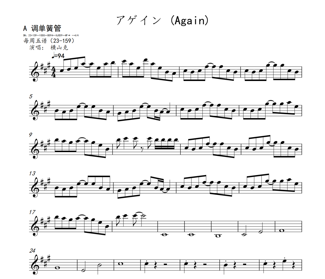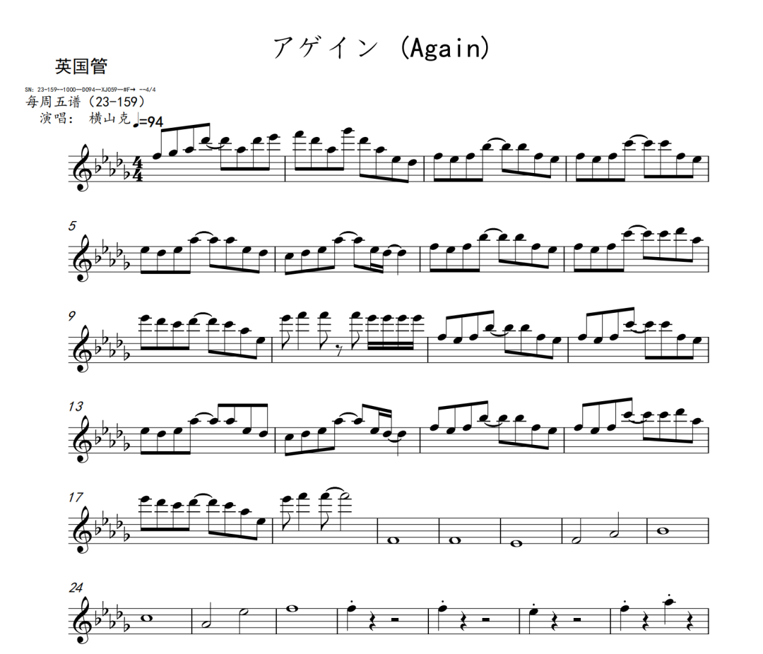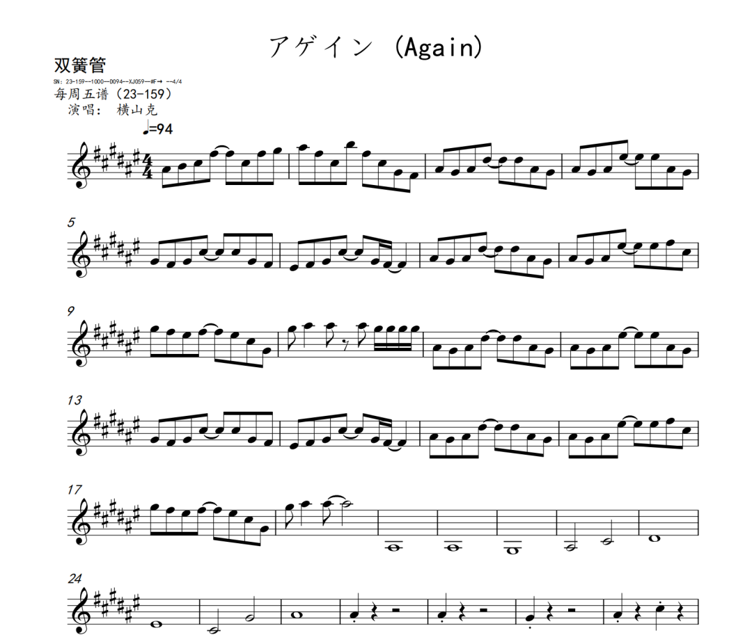 横山克《Again》短笛、长笛、双簧管、英国管、降B调单簧管、A调单簧管、降B调高音萨克斯、降E调中音萨克斯、降B调次中音萨克斯、降E调上低音萨克斯、大管、低音巴松、F调圆号、降B调小号、长号、大号、小提琴、中提琴、大提琴、大提琴高八度、低音提琴五线谱简谱简五谱简线谱
