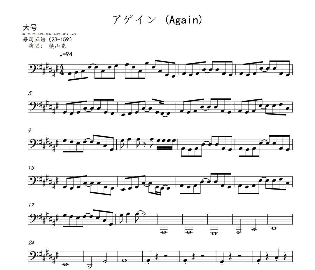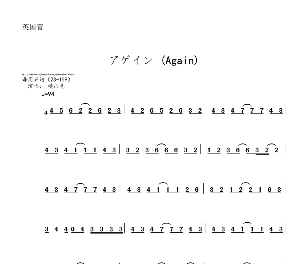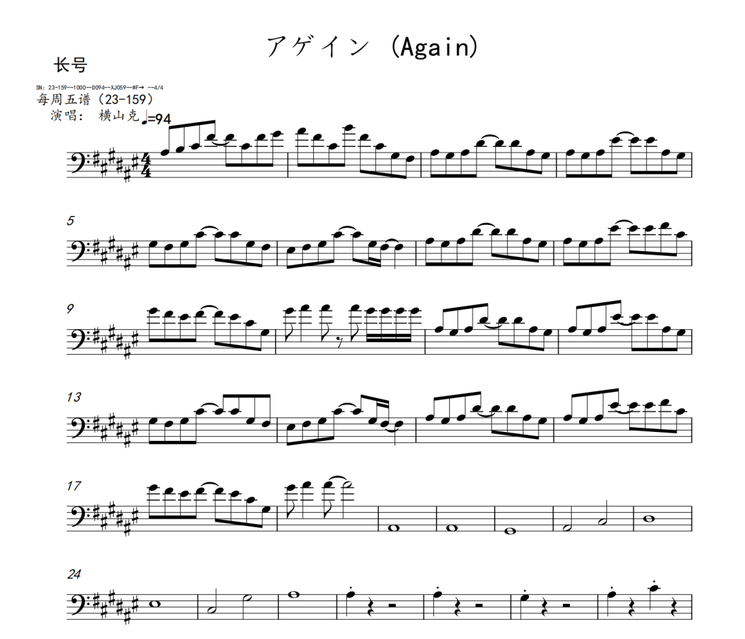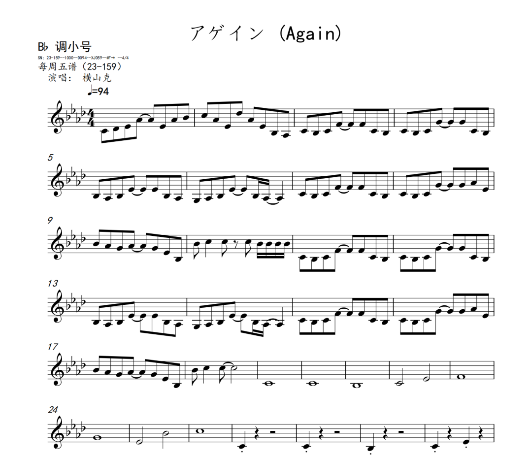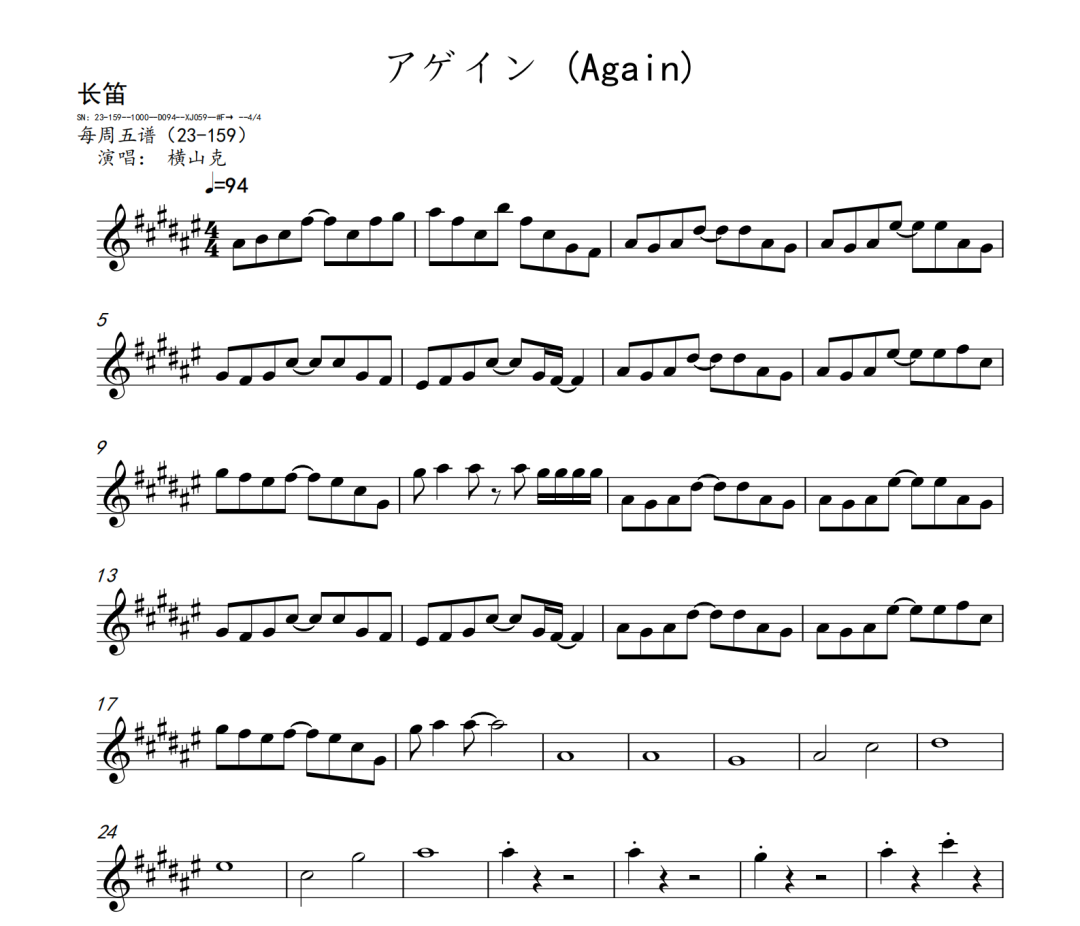 横山克《Again》短笛、长笛、双簧管、英国管、降B调单簧管、A调单簧管、降B调高音萨克斯、降E调中音萨克斯、降B调次中音萨克斯、降E调上低音萨克斯、大管、低音巴松、F调圆号、降B调小号、长号、大号、小提琴、中提琴、大提琴、大提琴高八度、低音提琴五线谱简谱简五谱简线谱