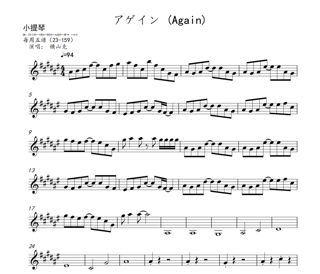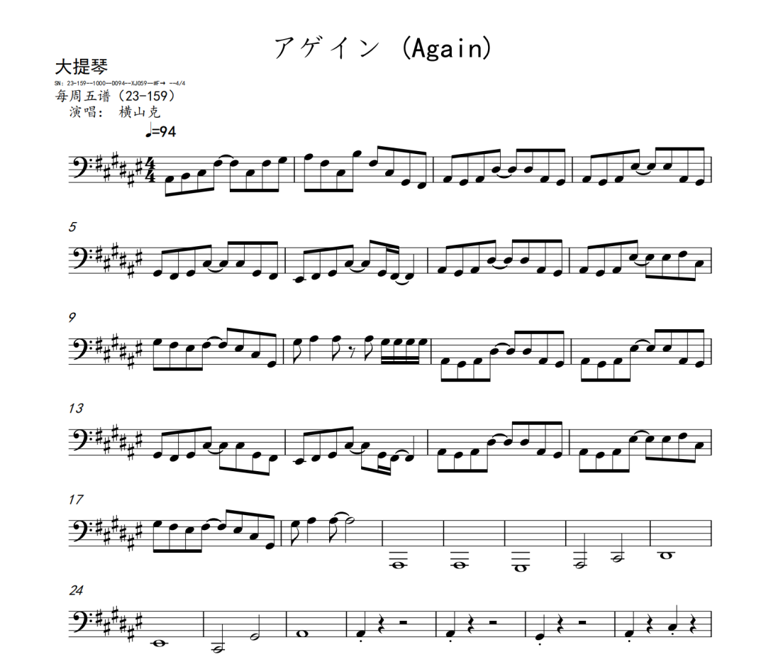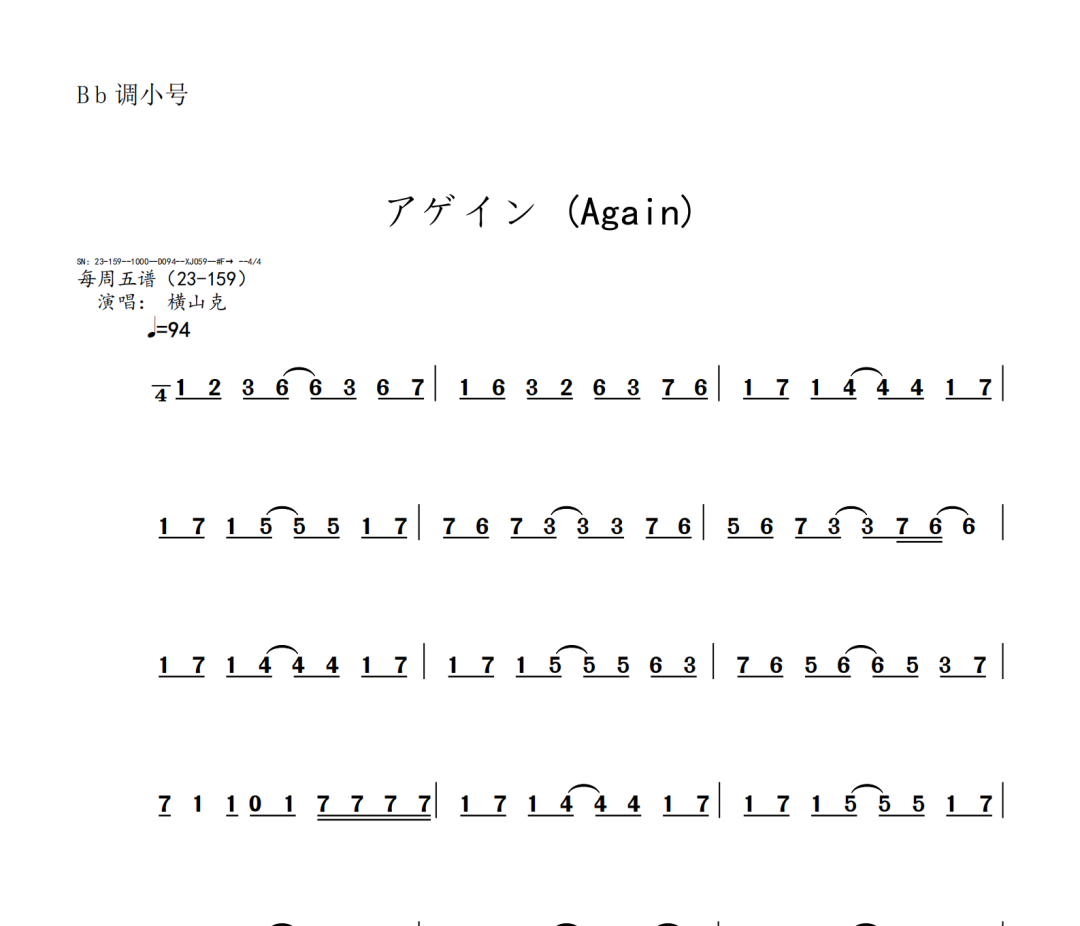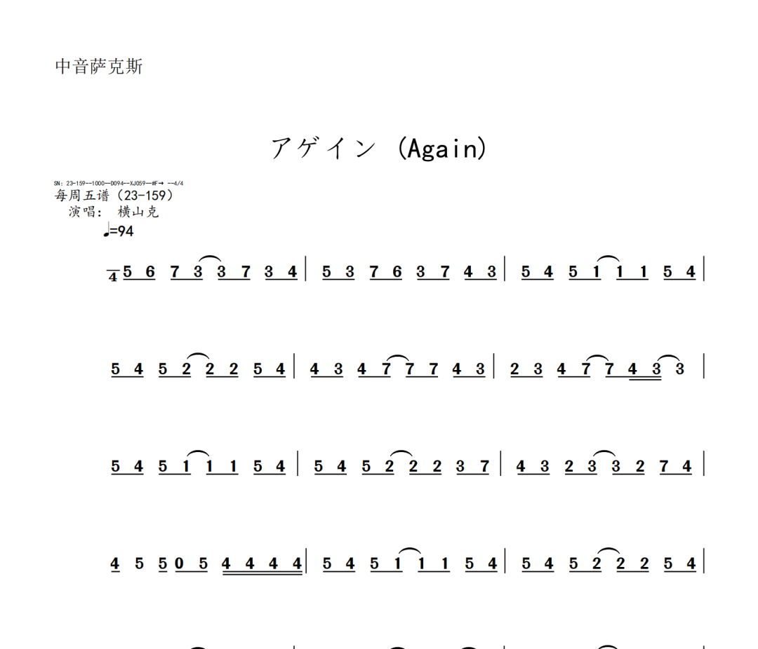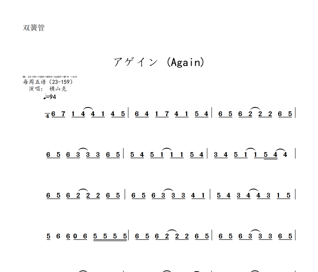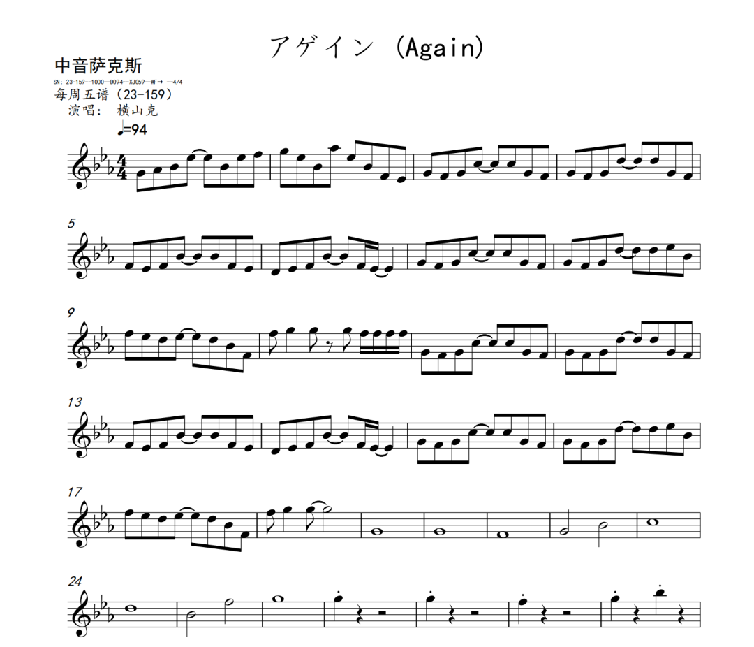 横山克《Again》短笛、长笛、双簧管、英国管、降B调单簧管、A调单簧管、降B调高音萨克斯、降E调中音萨克斯、降B调次中音萨克斯、降E调上低音萨克斯、大管、低音巴松、F调圆号、降B调小号、长号、大号、小提琴、中提琴、大提琴、大提琴高八度、低音提琴五线谱简谱简五谱简线谱