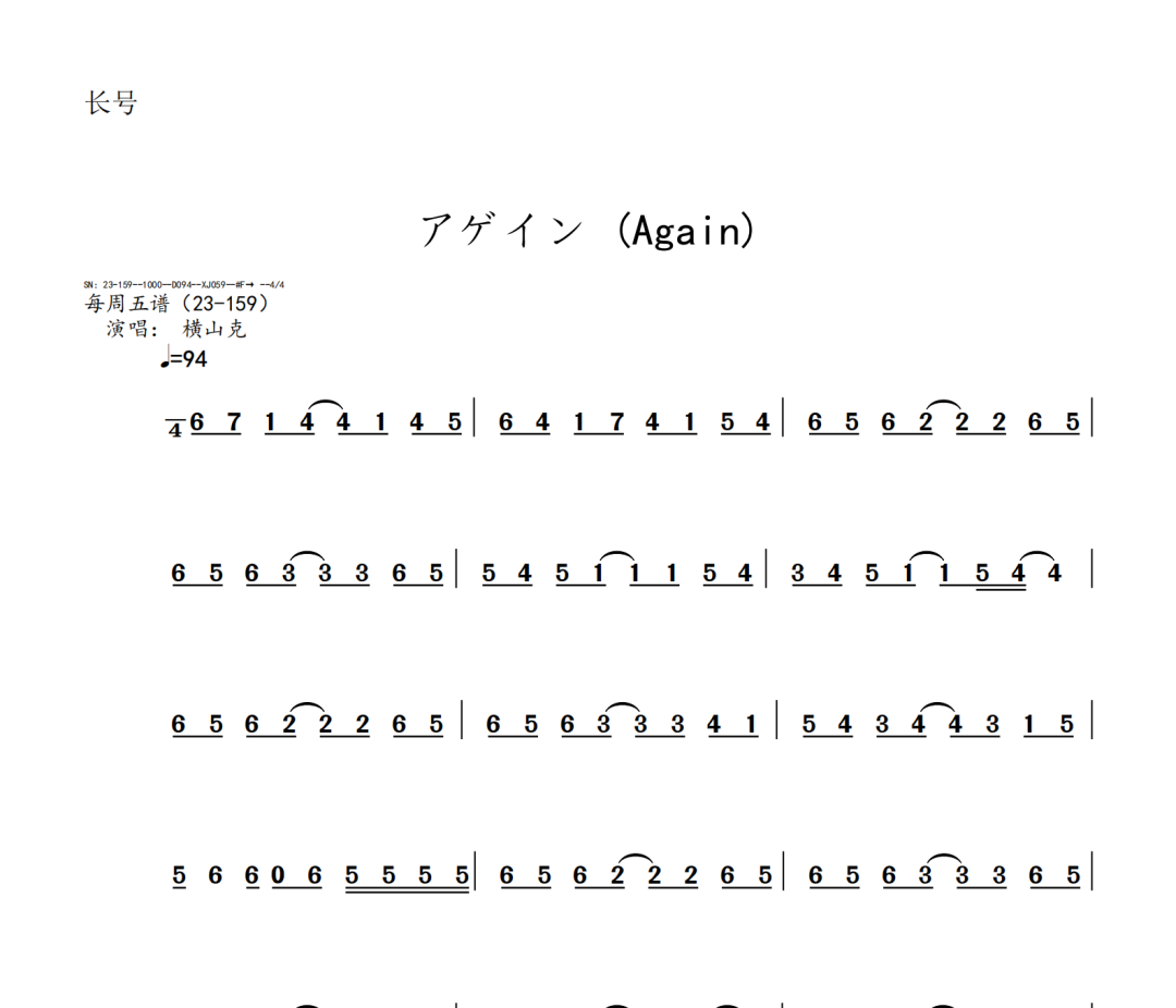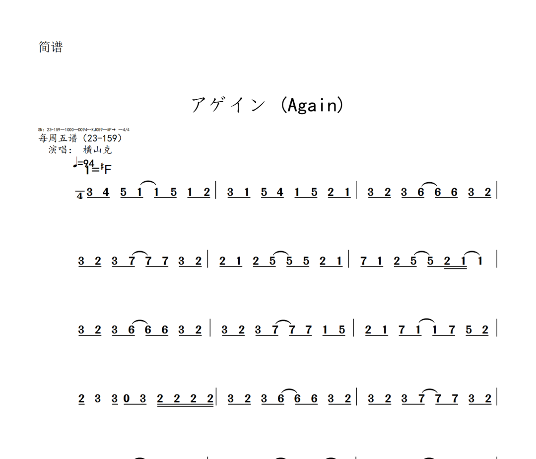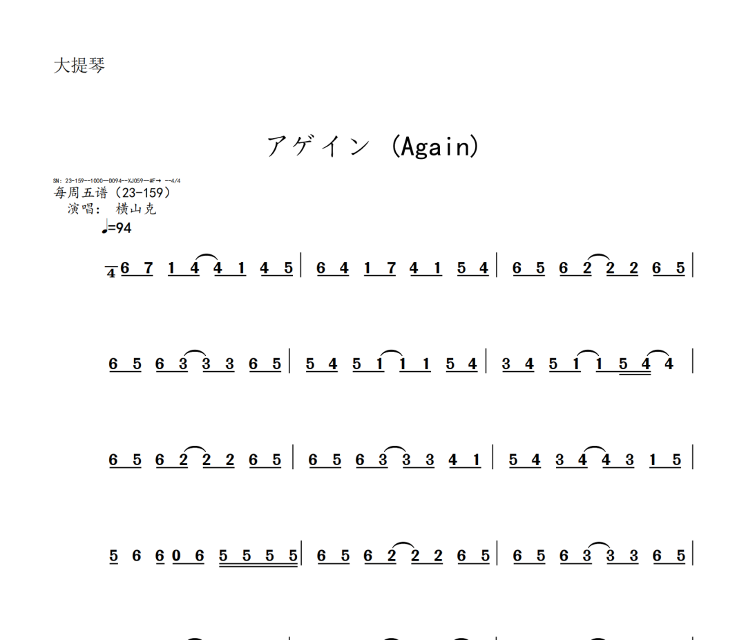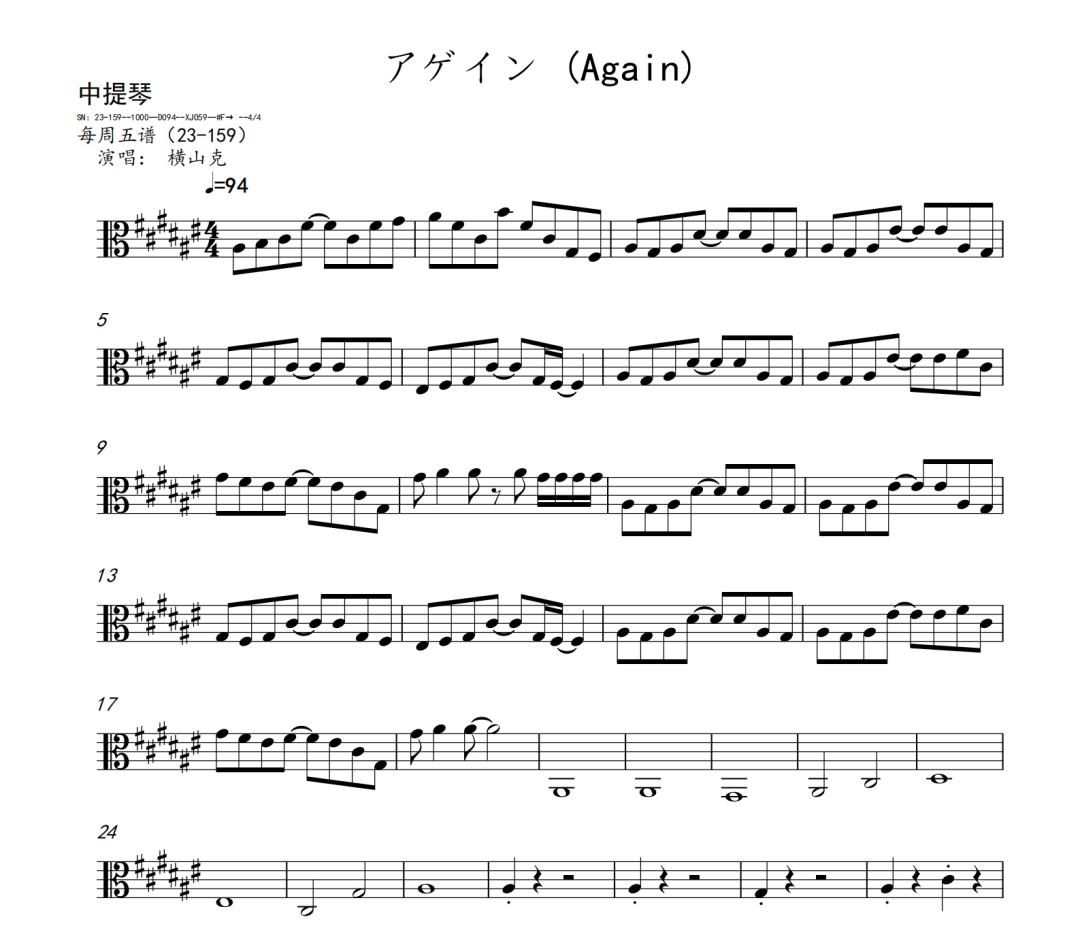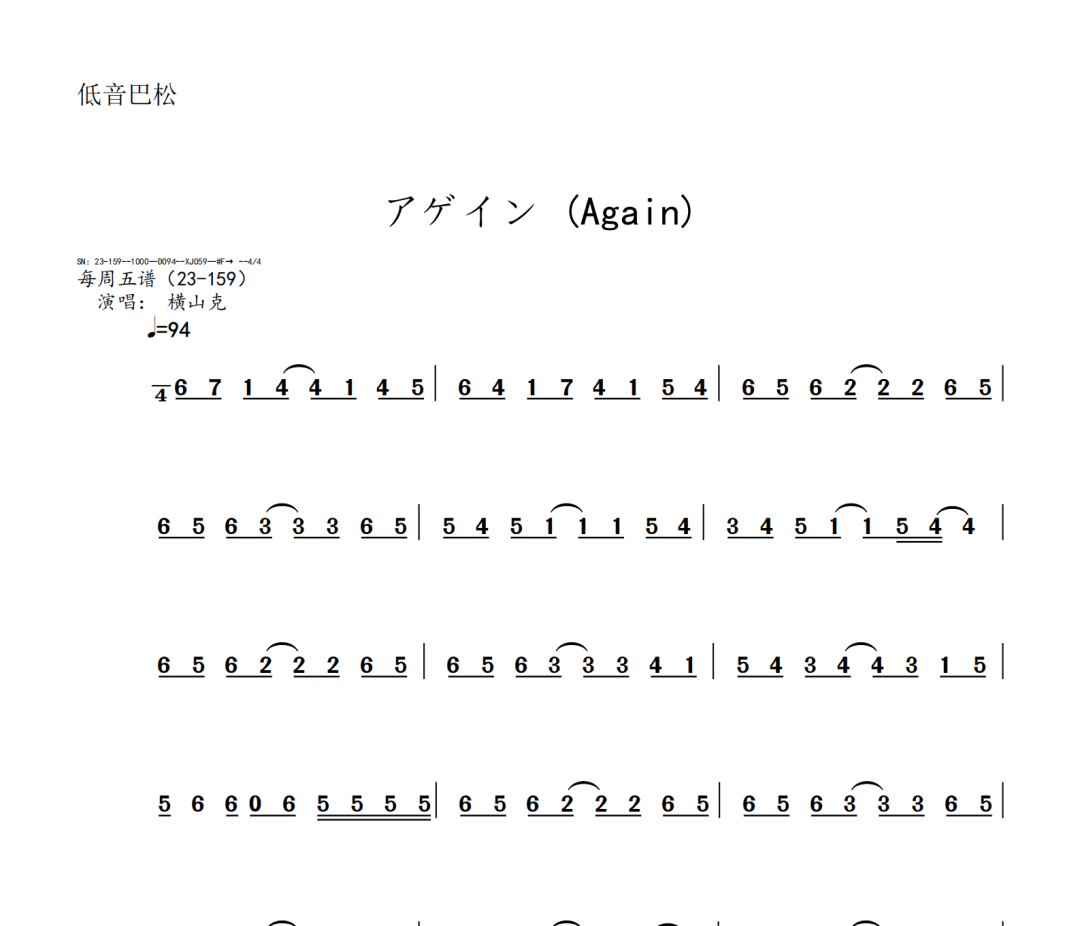 横山克《Again》短笛、长笛、双簧管、英国管、降B调单簧管、A调单簧管、降B调高音萨克斯、降E调中音萨克斯、降B调次中音萨克斯、降E调上低音萨克斯、大管、低音巴松、F调圆号、降B调小号、长号、大号、小提琴、中提琴、大提琴、大提琴高八度、低音提琴五线谱简谱简五谱简线谱