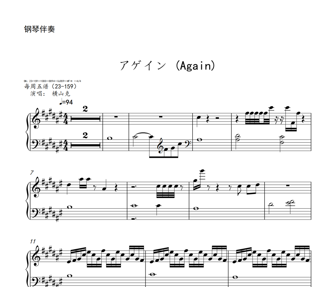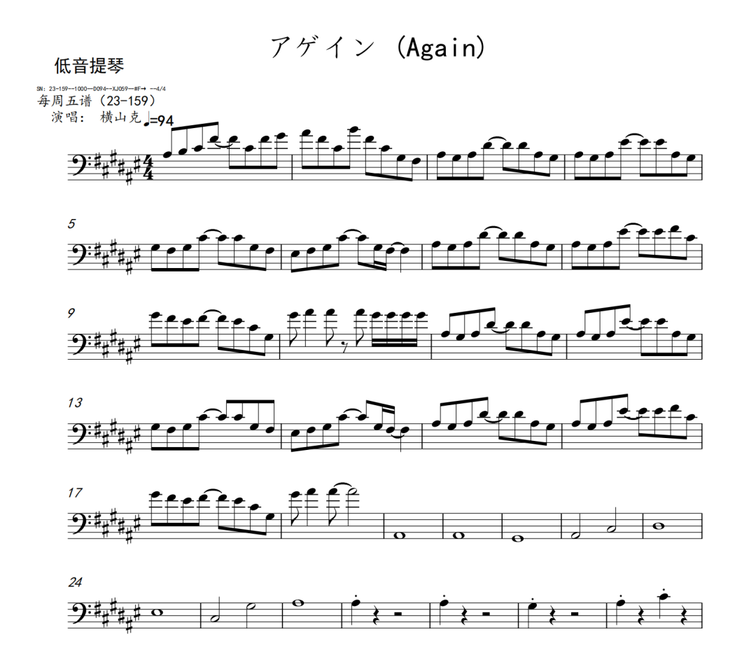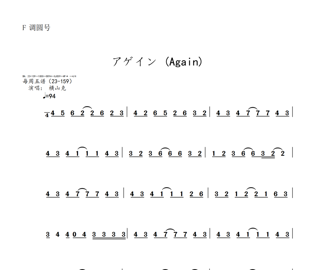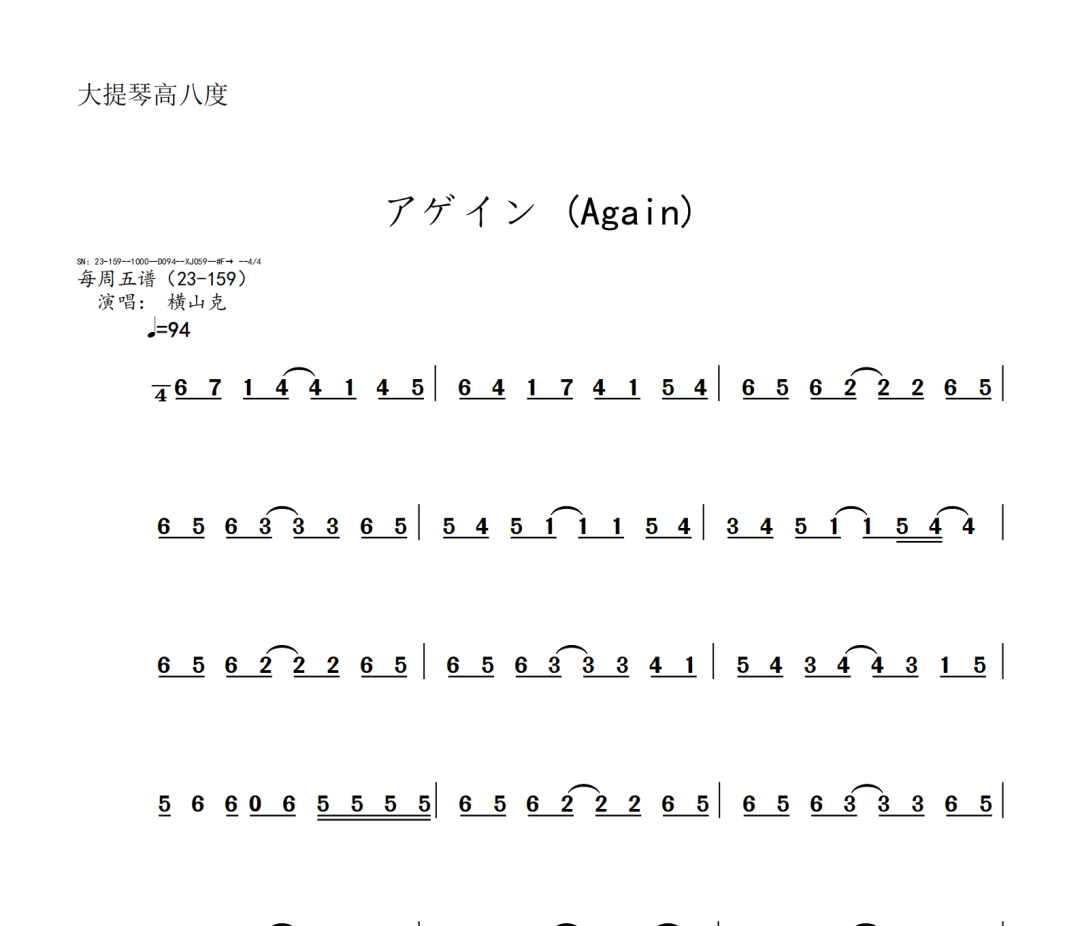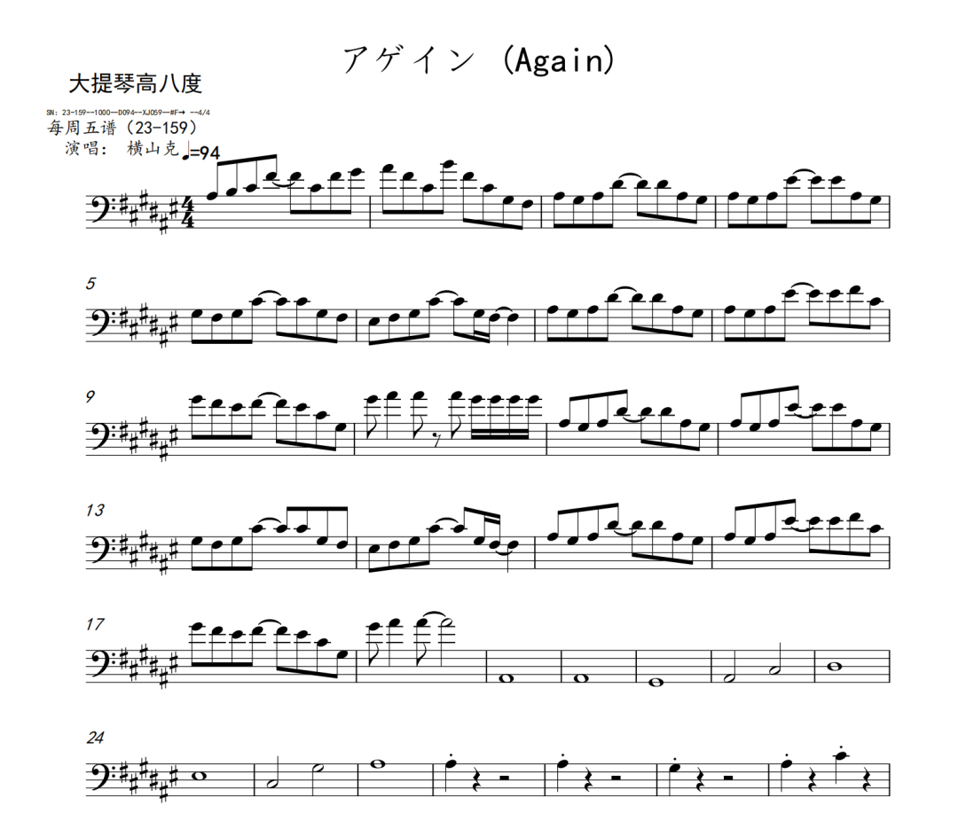 横山克《Again》短笛、长笛、双簧管、英国管、降B调单簧管、A调单簧管、降B调高音萨克斯、降E调中音萨克斯、降B调次中音萨克斯、降E调上低音萨克斯、大管、低音巴松、F调圆号、降B调小号、长号、大号、小提琴、中提琴、大提琴、大提琴高八度、低音提琴五线谱简谱简五谱简线谱