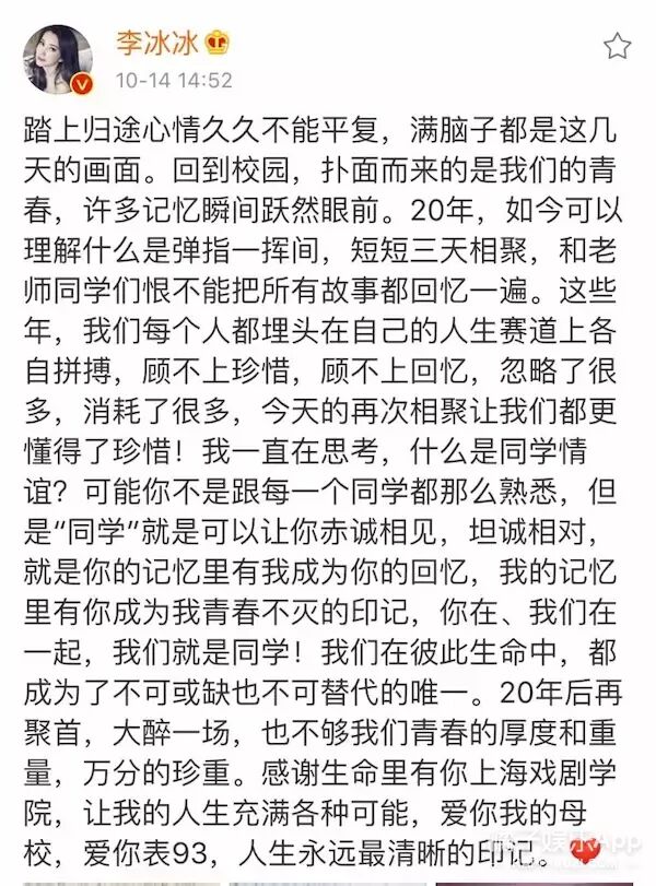 大家在上海相聚了3天,好好的叙了叙同窗情,李冰冰还发了条长微博感慨呢。