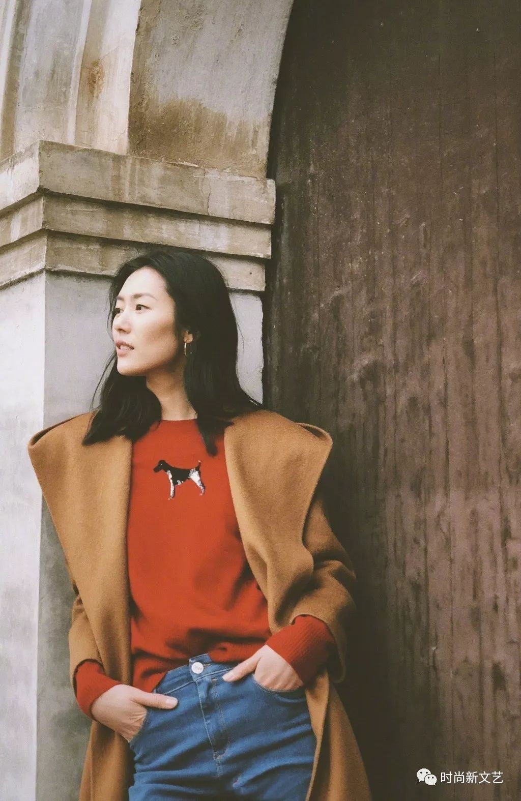 刘雯身着红色针织毛衣,搭配深蓝色牛仔长裤。外搭一件黄色羊绒大衣,一身搭配三种颜色撞到一起显得非常和谐。双手插兜,非常酷。