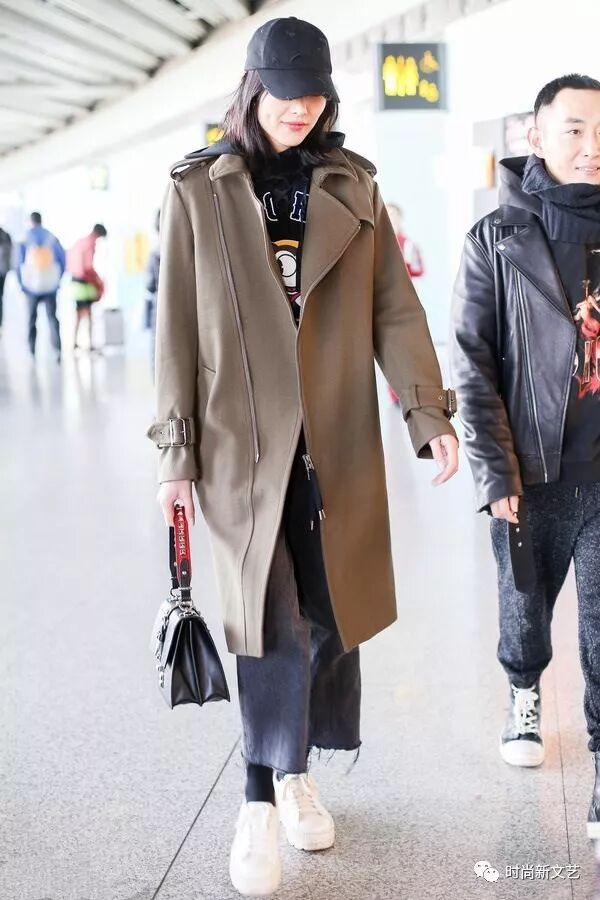 刘雯身着黑色圆领卫衣,搭配浅黑色牛仔阔腿裤,配上白色运动鞋,颜色搭配清新干净。外搭军绿色长款风衣,手拿黑色手包,打扮非常时髦。