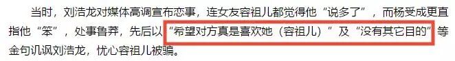 因为容祖儿和刘浩龙在名气等方面明显的女尊男卑差距,容祖儿的老板杨受成就曾讽刺刘浩龙“笨”,忧心容祖儿被骗,希望对方对这段恋情没有其他目的。