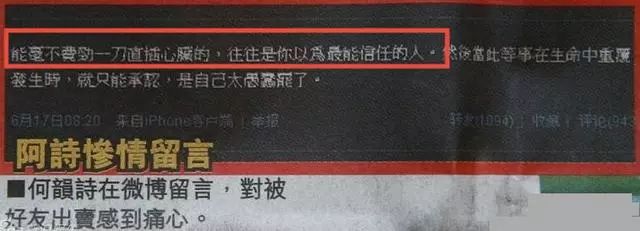 12年的时候却出了著名的刘浩龙“插刀”事件,刘浩龙承认和容祖儿在交往,何韵诗则于当时发布了一条痛心的微博,“能毫不费力动一刀直插心脏的,往往是你以为最能信任的人”,