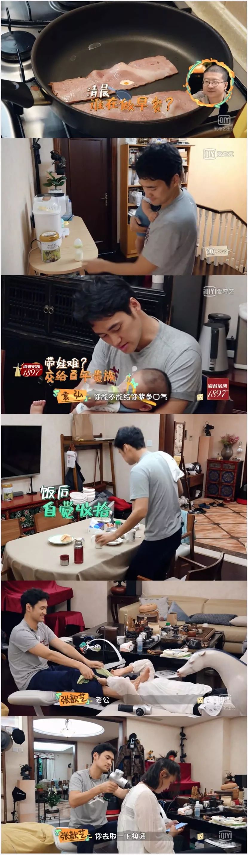 不仅是张歆艺的鼓励付出,袁弘也在主动承担家庭责任,帮助张歆艺分担家庭事务。6点已起床准备爱心早饭,张歆艺吃早饭,袁弘就在旁边给宝宝喂奶,饭后收拾、为老婆按摩、下楼给老婆拿快递......