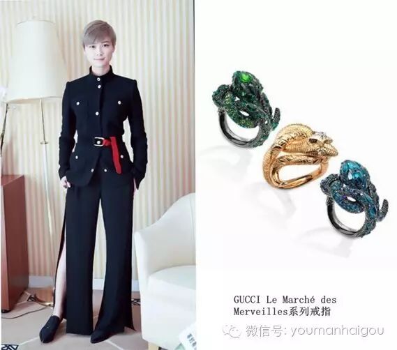 另外一套私服,春春换上了制服诱惑,这身Barbara Bui 2016秋冬系列套装搭配GUCCI Le Marché des Merveilles系列蛇形戒,你有看到她不经意间露出的性感小心机吗。