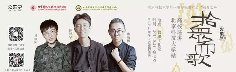 北京科技大学外国语学院“银杏之声”系列活动第六期-众乐纪「拾众而歌」校园音乐分享会,嘉宾信息,马雨阳,陈鸿宇,唐映枫。