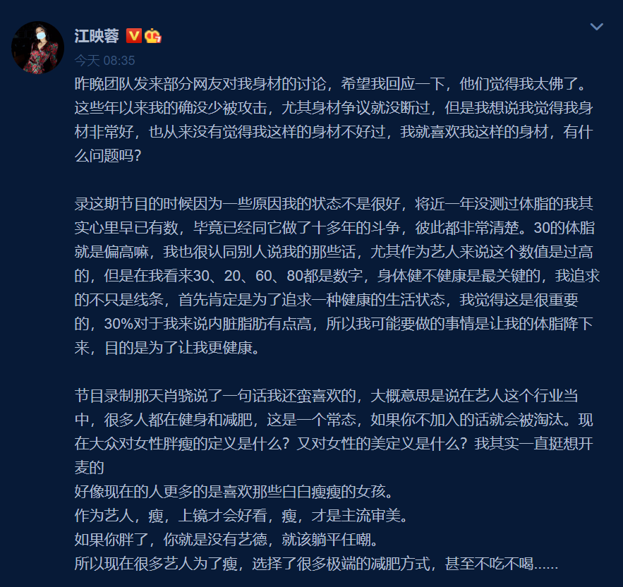 虽然一面倒的骂声中也有不少人表示支持江映蓉,并且强调个人身材与外界无关,但仍然被淹没在了质疑里,毕竟江映蓉身为艺人有身材管理的需求,减肥成了难以避免的事情。