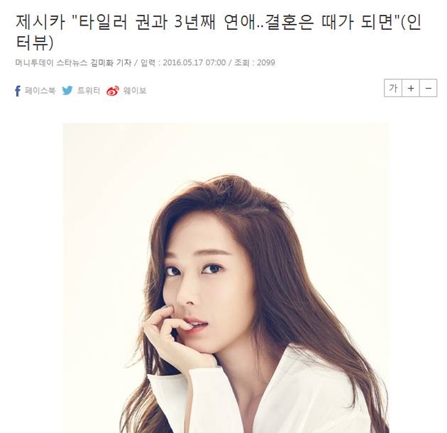 Jessica还表示周围很多朋友都结婚了,觉得很羡慕:“小的时候就对结婚有着幻想,如果时机到了,应该会结婚吧”。而当问起如果结婚想要几个孩子时,她则笑称:“我和妹妹(Krystal)在一起觉得很幸福,以后也想要两个孩子”。如此看来,这是好事将近的节奏啊!