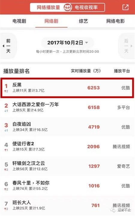 这部被冠以“真港剧”的《反黑》,首播3日就轻松破亿,豆瓣评分赶超7分,整个国庆期间都一直雄霸网剧播放榜的榜首,感觉向点击10亿级别进发的势头。