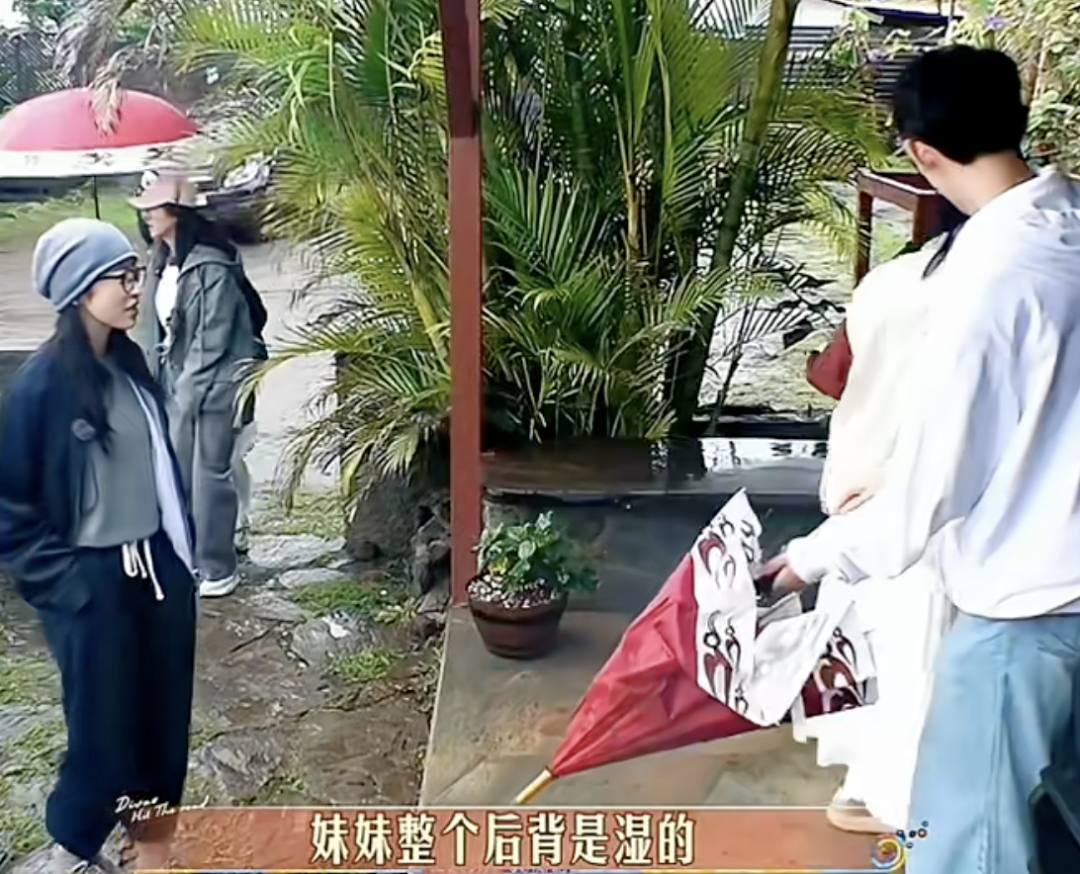 雨天和邓恩熙共撑一把伞外出,伞的角度始终偏向自己,女孩半边衣服都湿了。