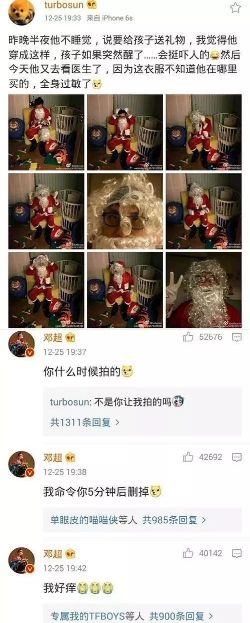 圣诞节的时候,邓超半夜不睡觉,坚持要自己扮成圣诞老人,给孩子们一个惊喜