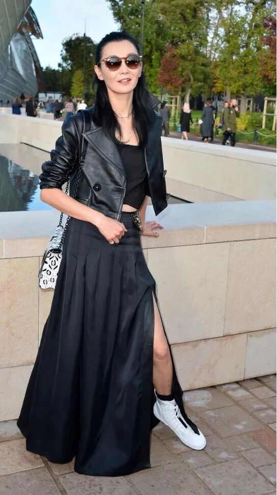 身上是穿着一套套装,可以看到里面穿着一件黑色的背心,而且外面搭配了一件皮革外套,这件皮革外套的长度还是比较短的那一种,这样的话显得整个人确实是比较的好看,下面搭配了一条黑色的裙子,这条裙子选择的还是开叉的设计。