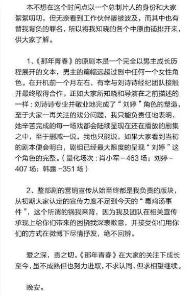 今日,《那年青春》的总制片人宗帅在个人微博上发表声明,称该剧本来就是以男主成长经历展开的文本,男主篇幅远超过任何一个女性角色,刘诗诗的戏份不存在删减之说。