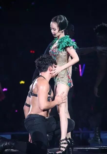 所以只要看蔡依林的演唱会基本每场都会值回票价。去年蔡依林“PLAY”世界巡回演唱会与男舞伴大玩SM,裸骑跪舔一如既往的夸张造型一套一套地换。最惊艳的是她头戴蛇姬头饰穿着性感泳衣型的舞衣大秀美腿和傲人上围。