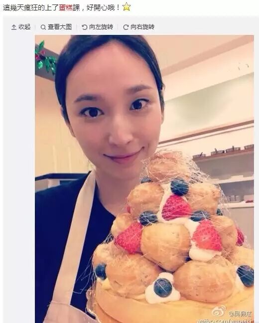 2012年,她不仅买来一整套烘焙器具,还在微博透露自己对照英文烘焙书自学,几乎掌握了戚风蛋糕、轻乳酪蛋糕、披萨、慕斯等多种西式甜点做法。