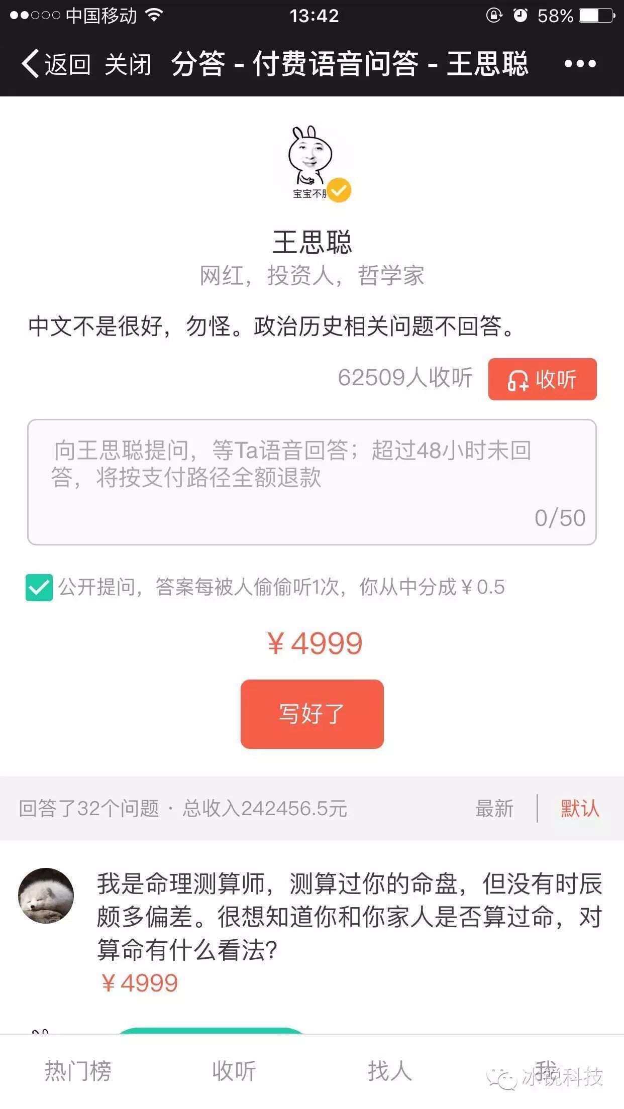 国名老公最近又火了,许多网友只听说过万达董事长王健林之子王思聪的名字,却没有亲耳听过他说话。如今有一款应用,不仅可以使网友听到王思聪讲话的声音,还可以获得直接向他提问的机会。这款应用就是“分答”。王思聪加入分答的答主队伍,更是吸引了近6万人前来收听,网友花23.8万,让王思聪回答了32个问题。