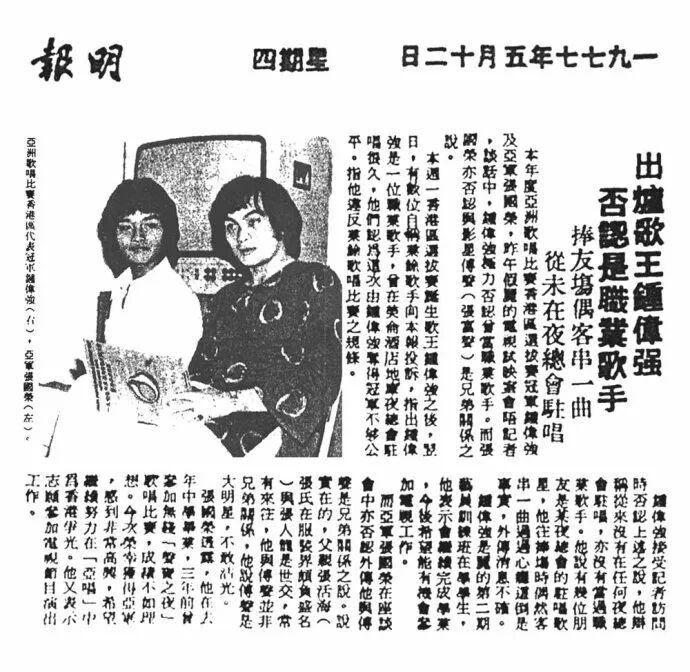 △1977年5月12日明报新闻,亚洲歌唱比赛冠军钟伟强和亚军张国荣