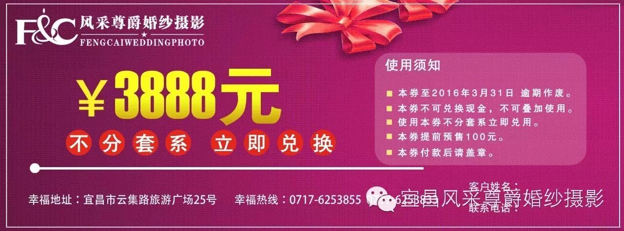 领取地址:宜昌市云集路旅游广场25号风采尊爵婚纱摄影