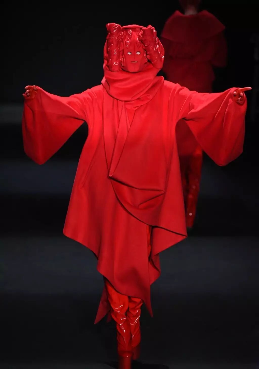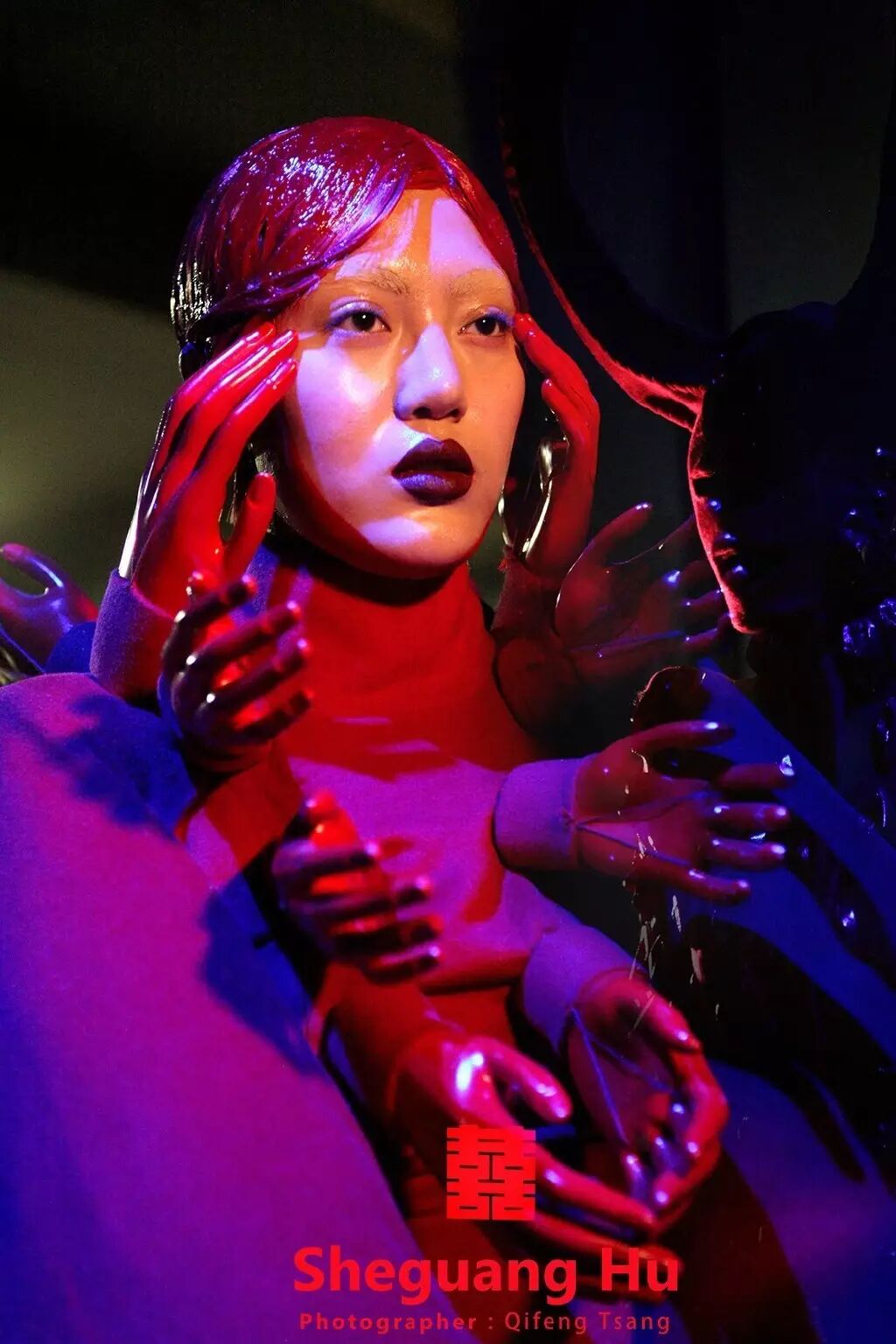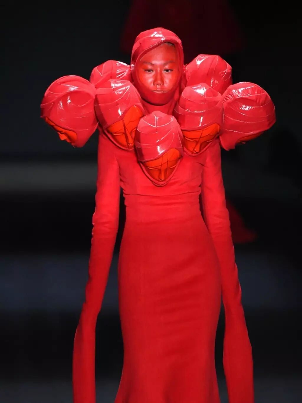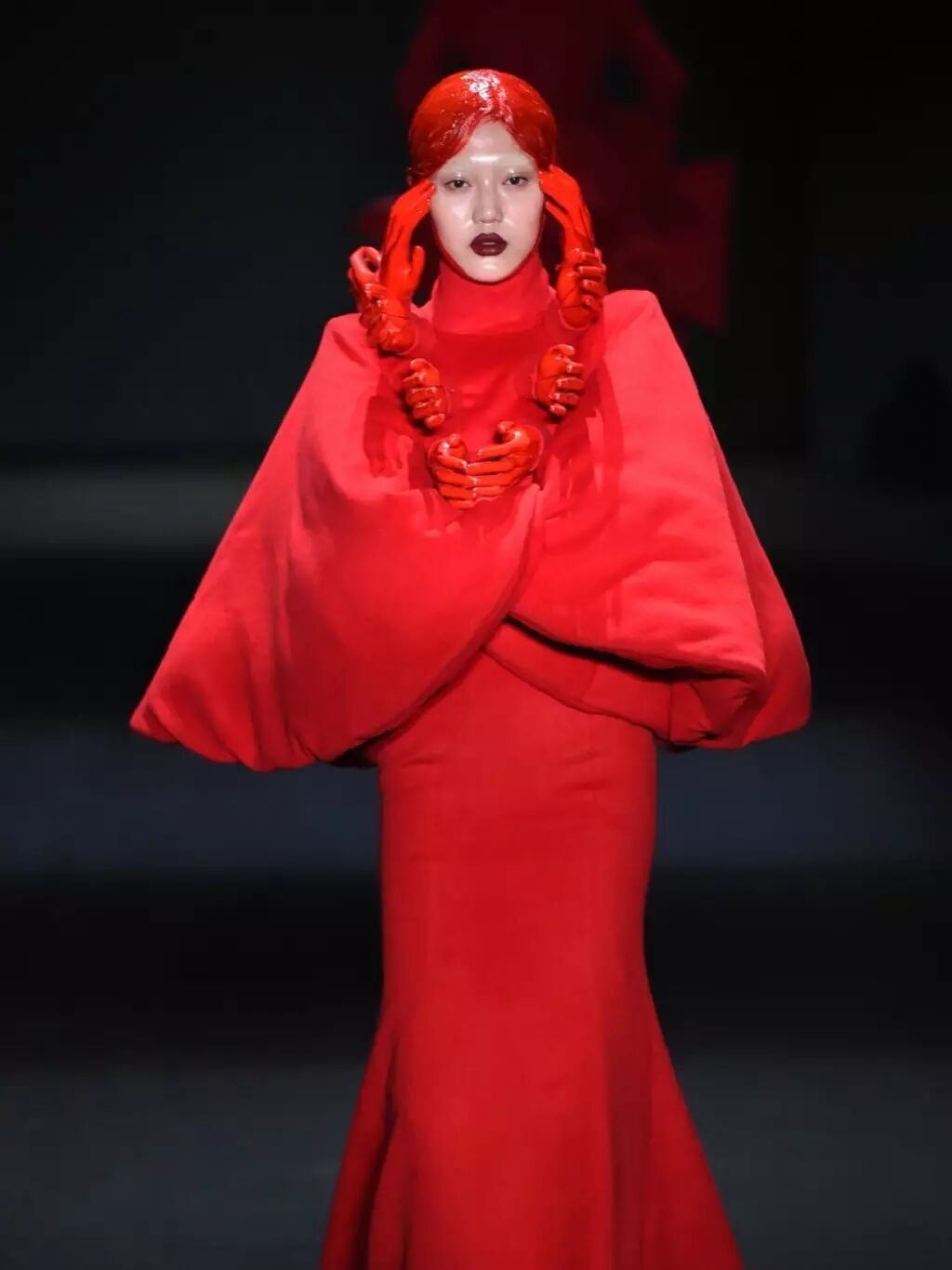设计师胡社光再出“神作”,所有模特全身上下包满红色,就像是新婚之夜各种溺死在红油漆中的畸形鬼新娘,吓得宝宝都吃不下晚饭了。。。