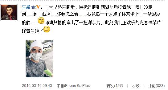 李晨在微博中写道:“一大早起来跑步,目标是跑到西湖然后绕着跑一圈!没想到......到了西湖......你猜怎么着......我竟然一个人点了杯茶坐上了一条游湖的船......师傅热情的拿出了一把洋芋片,此刻我们正欢乐的吃着洋芋片聊着白娘子。”