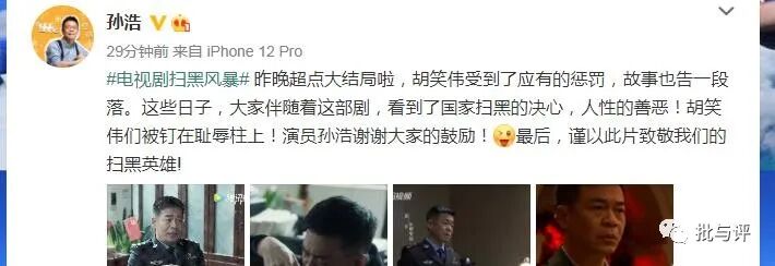 #电视剧扫黑风暴# 昨晚超点大结局啦,胡笑伟受到了应有的惩罚,故事也告一段落。这些日子,大家伴随着这部剧,看到了国家扫黑的决心,人性的善恶!胡笑伟们被钉在耻辱柱上!演员孙浩谢谢大家的鼓励![挤眼]最后,谨以此片致敬我们的扫黑英雄!