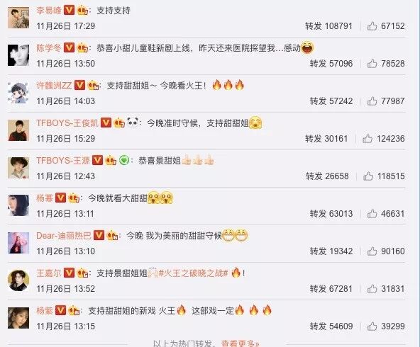 昨晚,景甜发布了一条微博宣传新戏《火王之破晓之战》开播,引得各路明星好友竟相转发宣传,这豪华的留言阵容,足可见大甜甜在圈里的好人缘!