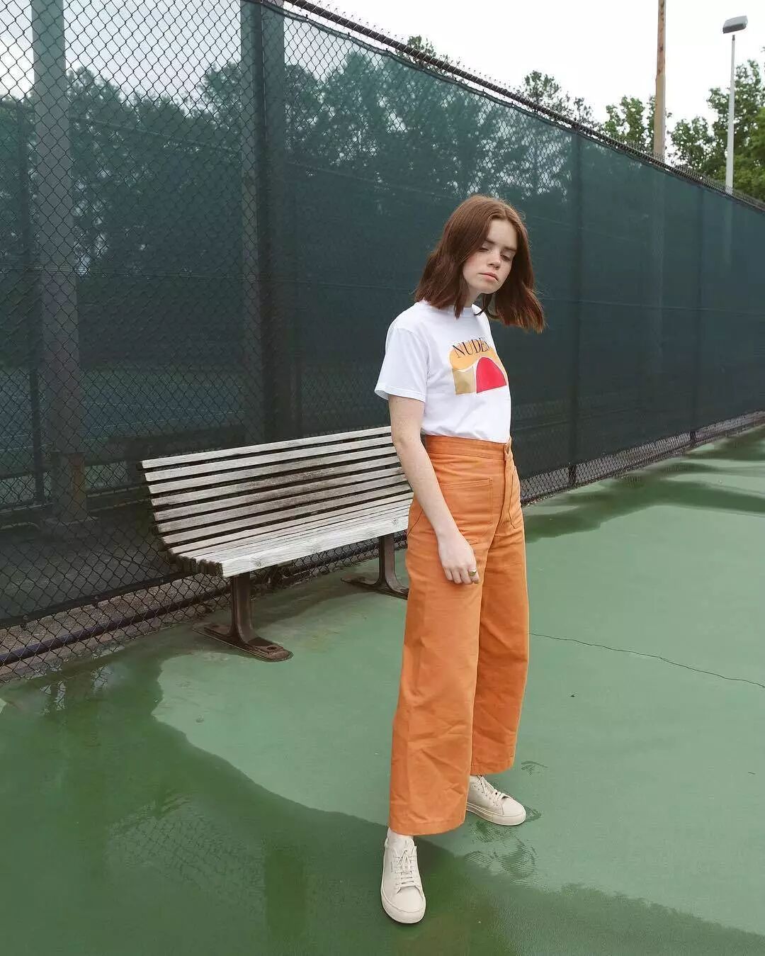 也可以搭配小白鞋,休闲一点。穿阔腿裤需要注意的是,上半身要搭配修身或者紧身的衣服,按照上紧下松的原则。