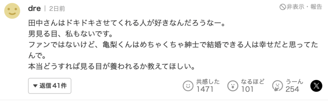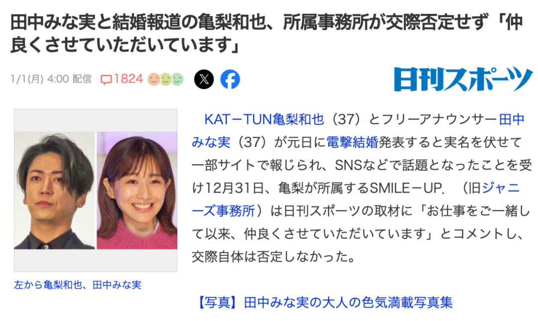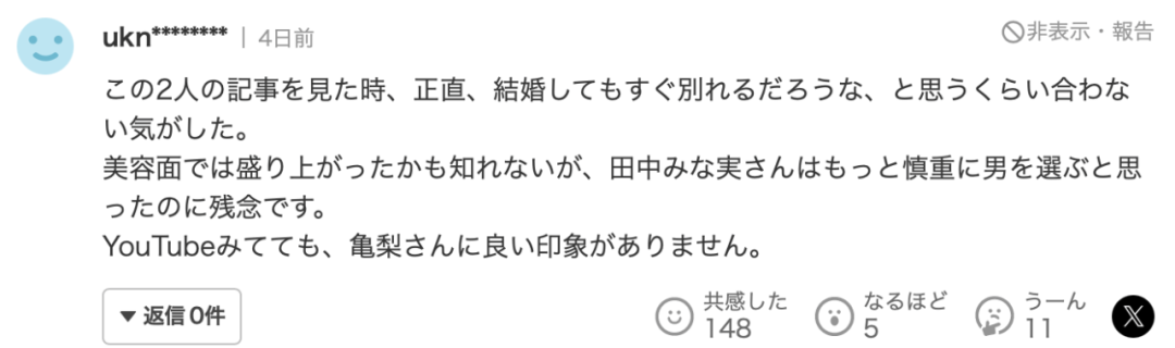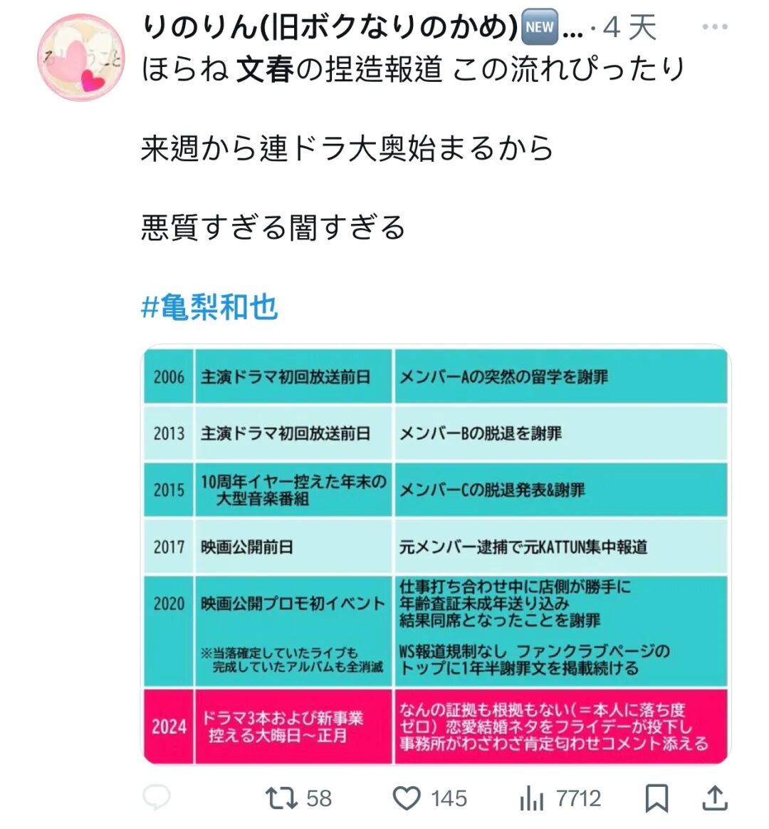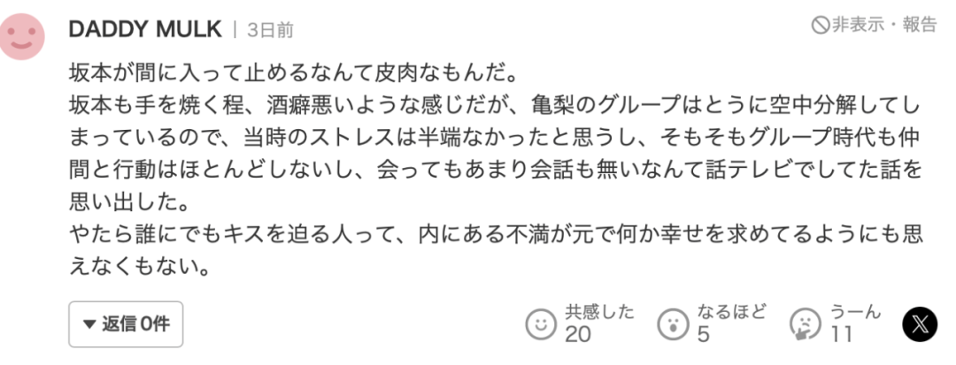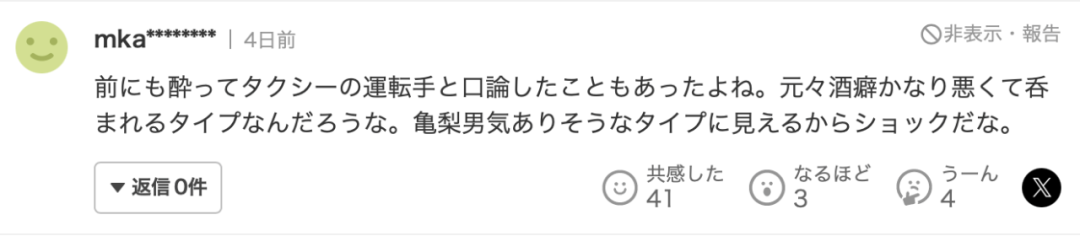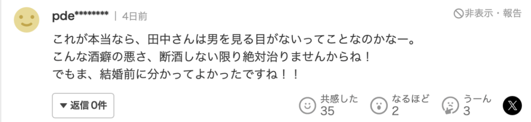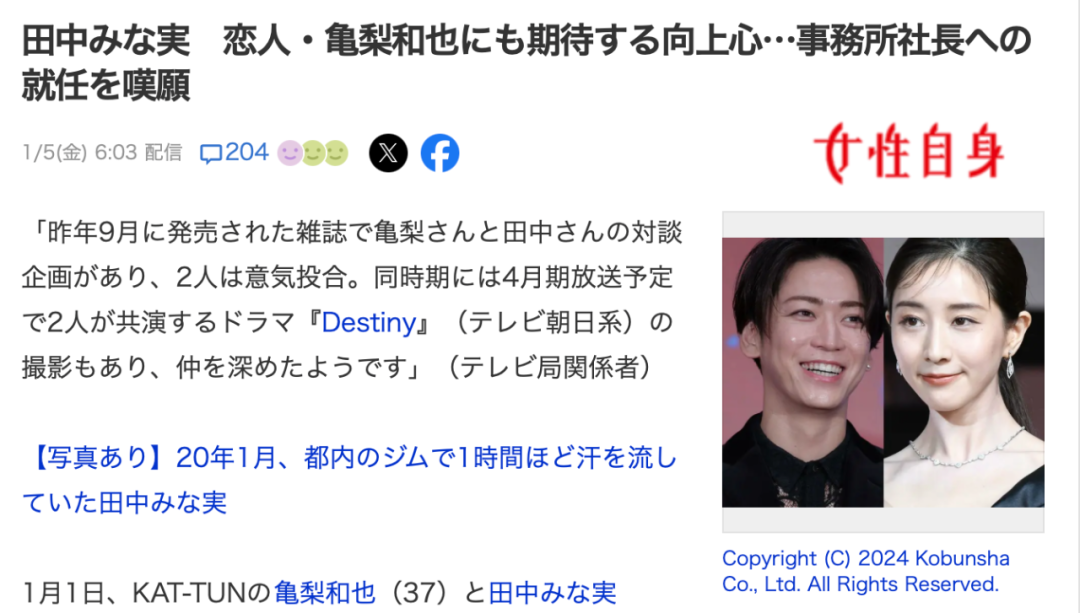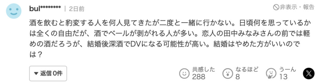 龟梨和也被曝热恋期强吻多位陪酒女,遭拒怒摔手机,网友却心疼他反骂其女友... 东京新青年 日韩男星 2024-01-13 18:01:59 392 创作不易,用心坚持,欢迎请BaGua喝几杯爱心咖啡!打赏并支持本文 打赏并删除本文 最近,日本国民偶像龟梨和也与女星田中美奈实官宣恋情。据日媒透露,他们至少秘密热恋了三个月,并计划于今年结婚。这是由于田中美奈实生育愿望很强烈,因此二人都以结婚为前提进行交往。随后,他们各自的事务所并未否认交往传闻,只是澄清“二人目前暂无结婚计划”,并表示“自从一起工作以来,彼此相处融洽、关系很好”。这是龟梨和也为数不多公开承认的恋情,对象还是与他同岁的美女姐姐田中,因此这段恋情最初也获得了中日两国众多网友的祝福。然而好景不长,文春速来倒油,猛曝龟梨和也“酒后变癫公、强吻发酒疯”。文春报道,据知情人士A先生透露,就在上个月中旬,正在热恋期的龟梨和也和他的“好基友”、知名棒球运动员、文春认证5A级渣男——坂本勇人,一起去了东京港区某高级会员制酒吧“X”(化名)喝酒作乐。龟梨是这家店的常客,出手阔绰,每次来都要坐套房,至少消费10万日元以上。大部分时候他是和朋友同行,偶尔也会一个人来喝。值得一提的是,他经常会和陪酒女喝个两小时才舍得离开。不过由于其频发的酒后癫公行为,龟梨令陪酒女闻风丧胆,早已被这家店列入黑名单。A先生大吐苦水,痛斥龟梨的恶劣行径。龟梨常常会在喝醉的情况下来到这家店续摊、大发酒疯。他对服务生的态度会变得很傲慢,常常会居高临下的口吻对服务生呼来喝去。那天他也是浑身酒气和坂本勇人一起来到店里,屁股都没坐热就要强吻身边的陪酒女。即便有男性工作人员多次上前制止“请不要这样做”,龟梨仍然不依不饶要强吻。前两位陪酒女都婉拒了,第三位陪酒女很惊慌,她直接拒绝了龟梨的强吻要求。没想到龟梨恼羞成怒、化身癫公。他大发雷霆、厉声质问对方“为什么不跟我接吻?!”。随即怒摔手机、扔向对方,吓得这位陪酒女大哭。他的这种癫公行为就连坂本勇人都看不下去,于是坂本勇人赶紧上前劝和、拉着龟梨离开了这家店。A先生直言,龟梨这种酒后强吻行为已经不是第一次了。因此,每当大家知道他要来,陪酒女和服务生都不想去他的套房里。大家对他的印象都极差。“他完全配不上田中女士,为什么田中会看上他呢?他们在一起实在是太不可思议了。”A先生表示,当龟梨和也和田中美奈实官宣恋情时,大家都大跌眼镜。他们认为,酒品恶劣的癫公是无法与高情商、充满女性魅力的女神相配的。事实上,这并非龟梨和也第一次因喝酒而闹出的负面新闻。2020年,他就因和未成年少女喝酒而被杰尼斯处分。当时正值疫情,大部分日本艺人都响应政府要求、不出门宅家活动。然而文春曝光龟梨和也和山下智久不堪寂寞、和多位未成年少女一同喝酒。酒局后山下智久和未成年少女下榻同一间酒店,而龟梨和则独自回家。这件事引发舆论哗然,日本网友都在指责这两人没有尽到公众人物的责任。为此,杰尼斯(已倒闭)决定对两人进行处分。龟梨和也被勒令“严重警告和书面反省”。随后,他很快在其出演的电影发布会上为自己的行为公开谢罪。由于当时大家都在讨伐山下智久和未成年少女过夜,因此削弱了对龟梨和也的声讨。不过还是有不少网友在猛烈批评他,皆因在几个月前他在某综艺节目上大谈自己小时候最爱掀女孩的裙子。“我在幼儿园时期是掀裙子界的头号王牌。”龟梨大谈自己在幼儿园时期是如何掀女孩子裙子的,不是一次,而是惯犯。他不以此为耻,反而夸夸其谈,居然还做出掀裙子的手势,大肆炫耀。小男孩做出这种性骚扰行为,很多人会认为是不懂事。但是作为一个成年人、还是一个靠女性粉丝打投养活的国民偶像如此炫耀自己的性骚扰往事,的确很令人下头。这让许多日本网友不寒而栗,认为他这只曾掀过幼女裙子的手实在是太可怕了…自从1998年加入杰尼斯以来,龟梨和也一直都是以“自律的完美偶像”形象示人,如今频频曝出这些丑闻,日本网友却在嘲笑讥讽田中美奈实没有看男人的眼光。“如果这是真的,那不就说明田中女士完全没有看男人的眼光吗?像这种酒品恶劣的,不戒酒的话是绝对不会变好的。不过在结婚前就知道这事,实在是太好了。”“美奈实酱果然没有看男人的眼光吧,还是喜欢这种男人,不管怎么说,还好没结婚。”大家纷纷猜测,田中美奈实是不是很着急要结婚生子?因为放眼望去她身边的女主播大部分都结婚了,比如她的好搭档弘中绫香早已结婚生子了。“田中曾在电视上说过,因为想要像桥本环奈那样可爱的孩子,所以想和帅哥结婚。那时我还觉得她只是说说而已…就是喜欢帅哥吗?但是小时候的龟梨和也是帅哥吗?”“我还以为田中女士是女主播的另类先锋呢,但现在看来她是觉得自己落后于他人了吗?所以着急了吗?如果她能坚持单身的话,说不定会有更美好的相遇呢?”许多日本网友撤回了对二人的祝福、唱衰这段的恋情,纷纷劝田中赶紧离开这个酒品恶劣的人。“当时看到二人恋情的报道时,我觉得哪怕他们结婚了也会很快离婚,感觉这两人完全不合适。即便两人在美容方面会有共鸣。我本以为田中美奈实会更加谨慎选择男人,真是太可惜了。看过油管后,我对龟梨没有什么好印象。”“之