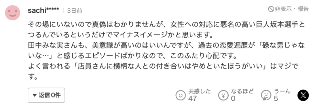 龟梨和也被曝热恋期强吻多位陪酒女,遭拒怒摔手机,网友却心疼他反骂其女友... 东京新青年 日韩男星 2024-01-13 18:01:59 394 创作不易,用心坚持,欢迎请BaGua喝几杯爱心咖啡!打赏并支持本文 打赏并删除本文 最近,日本国民偶像龟梨和也与女星田中美奈实官宣恋情。据日媒透露,他们至少秘密热恋了三个月,并计划于今年结婚。这是由于田中美奈实生育愿望很强烈,因此二人都以结婚为前提进行交往。随后,他们各自的事务所并未否认交往传闻,只是澄清“二人目前暂无结婚计划”,并表示“自从一起工作以来,彼此相处融洽、关系很好”。这是龟梨和也为数不多公开承认的恋情,对象还是与他同岁的美女姐姐田中,因此这段恋情最初也获得了中日两国众多网友的祝福。然而好景不长,文春速来倒油,猛曝龟梨和也“酒后变癫公、强吻发酒疯”。文春报道,据知情人士A先生透露,就在上个月中旬,正在热恋期的龟梨和也和他的“好基友”、知名棒球运动员、文春认证5A级渣男——坂本勇人,一起去了东京港区某高级会员制酒吧“X”(化名)喝酒作乐。龟梨是这家店的常客,出手阔绰,每次来都要坐套房,至少消费10万日元以上。大部分时候他是和朋友同行,偶尔也会一个人来喝。值得一提的是,他经常会和陪酒女喝个两小时才舍得离开。不过由于其频发的酒后癫公行为,龟梨令陪酒女闻风丧胆,早已被这家店列入黑名单。A先生大吐苦水,痛斥龟梨的恶劣行径。龟梨常常会在喝醉的情况下来到这家店续摊、大发酒疯。他对服务生的态度会变得很傲慢,常常会居高临下的口吻对服务生呼来喝去。那天他也是浑身酒气和坂本勇人一起来到店里,屁股都没坐热就要强吻身边的陪酒女。即便有男性工作人员多次上前制止“请不要这样做”,龟梨仍然不依不饶要强吻。前两位陪酒女都婉拒了,第三位陪酒女很惊慌,她直接拒绝了龟梨的强吻要求。没想到龟梨恼羞成怒、化身癫公。他大发雷霆、厉声质问对方“为什么不跟我接吻?!”。随即怒摔手机、扔向对方,吓得这位陪酒女大哭。他的这种癫公行为就连坂本勇人都看不下去,于是坂本勇人赶紧上前劝和、拉着龟梨离开了这家店。A先生直言,龟梨这种酒后强吻行为已经不是第一次了。因此,每当大家知道他要来,陪酒女和服务生都不想去他的套房里。大家对他的印象都极差。“他完全配不上田中女士,为什么田中会看上他呢?他们在一起实在是太不可思议了。”A先生表示,当龟梨和也和田中美奈实官宣恋情时,大家都大跌眼镜。他们认为,酒品恶劣的癫公是无法与高情商、充满女性魅力的女神相配的。事实上,这并非龟梨和也第一次因喝酒而闹出的负面新闻。2020年,他就因和未成年少女喝酒而被杰尼斯处分。当时正值疫情,大部分日本艺人都响应政府要求、不出门宅家活动。然而文春曝光龟梨和也和山下智久不堪寂寞、和多位未成年少女一同喝酒。酒局后山下智久和未成年少女下榻同一间酒店,而龟梨和则独自回家。这件事引发舆论哗然,日本网友都在指责这两人没有尽到公众人物的责任。为此,杰尼斯(已倒闭)决定对两人进行处分。龟梨和也被勒令“严重警告和书面反省”。随后,他很快在其出演的电影发布会上为自己的行为公开谢罪。由于当时大家都在讨伐山下智久和未成年少女过夜,因此削弱了对龟梨和也的声讨。不过还是有不少网友在猛烈批评他,皆因在几个月前他在某综艺节目上大谈自己小时候最爱掀女孩的裙子。“我在幼儿园时期是掀裙子界的头号王牌。”龟梨大谈自己在幼儿园时期是如何掀女孩子裙子的,不是一次,而是惯犯。他不以此为耻,反而夸夸其谈,居然还做出掀裙子的手势,大肆炫耀。小男孩做出这种性骚扰行为,很多人会认为是不懂事。但是作为一个成年人、还是一个靠女性粉丝打投养活的国民偶像如此炫耀自己的性骚扰往事,的确很令人下头。这让许多日本网友不寒而栗,认为他这只曾掀过幼女裙子的手实在是太可怕了…自从1998年加入杰尼斯以来,龟梨和也一直都是以“自律的完美偶像”形象示人,如今频频曝出这些丑闻,日本网友却在嘲笑讥讽田中美奈实没有看男人的眼光。“如果这是真的,那不就说明田中女士完全没有看男人的眼光吗?像这种酒品恶劣的,不戒酒的话是绝对不会变好的。不过在结婚前就知道这事,实在是太好了。”“美奈实酱果然没有看男人的眼光吧,还是喜欢这种男人,不管怎么说,还好没结婚。”大家纷纷猜测,田中美奈实是不是很着急要结婚生子?因为放眼望去她身边的女主播大部分都结婚了,比如她的好搭档弘中绫香早已结婚生子了。“田中曾在电视上说过,因为想要像桥本环奈那样可爱的孩子,所以想和帅哥结婚。那时我还觉得她只是说说而已…就是喜欢帅哥吗?但是小时候的龟梨和也是帅哥吗?”“我还以为田中女士是女主播的另类先锋呢,但现在看来她是觉得自己落后于他人了吗?所以着急了吗?如果她能坚持单身的话,说不定会有更美好的相遇呢?”许多日本网友撤回了对二人的祝福、唱衰这段的恋情,纷纷劝田中赶紧离开这个酒品恶劣的人。“当时看到二人恋情的报道时,我觉得哪怕他们结婚了也会很快离婚,感觉这两人完全不合适。即便两人在美容方面会有共鸣。我本以为田中美奈实会更加谨慎选择男人,真是太可惜了。看过油管后,我对龟梨没有什么好印象。”“之