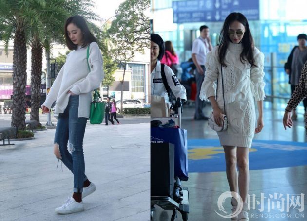 大幂幂白色毛衣配破洞裤,温柔不失帅气;糖糖长款毛衣穿出甜美。一攻一受超级有爱~