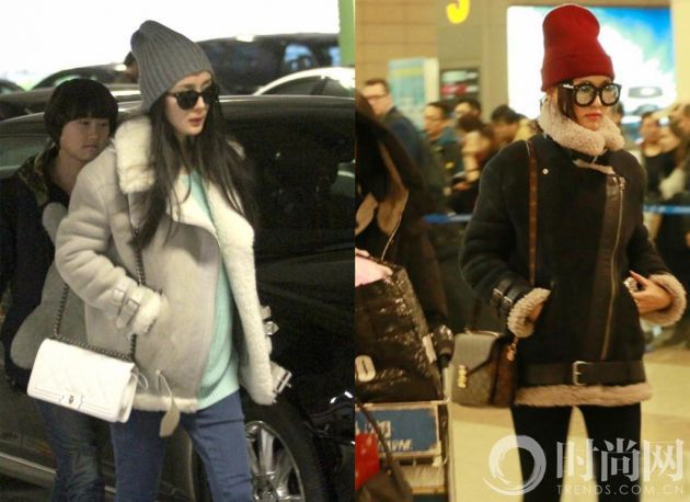 外套一黑一白,帽子一红一灰,比起闺蜜装更有情侣装的 feel ,在机场这么“招摇”秀恩爱真的好么?