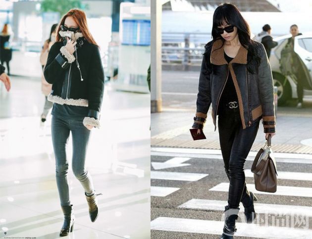 统一的短款羊羔毛外套,小脚裤,中筒高跟靴,帅气的不能更默契。