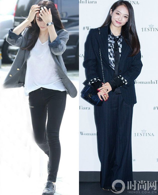 水晶简约白 T & 黑色小脚裤配灰色西装,符合她一贯的帅气;宋茜选择了条纹西装,阔腿裤略显成熟了一些,姐姐范儿十足。果然水晶是被照顾的那一个啊~