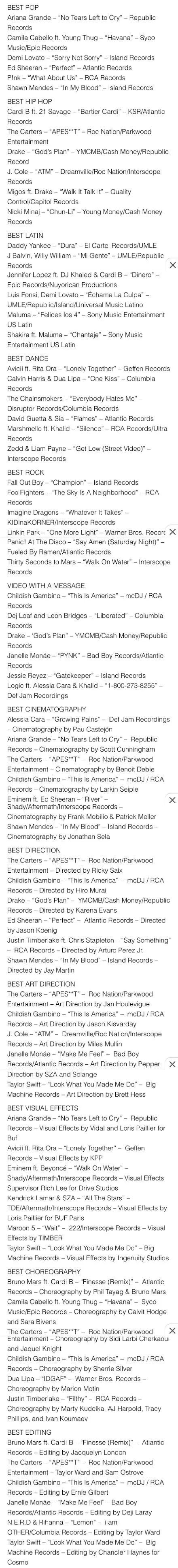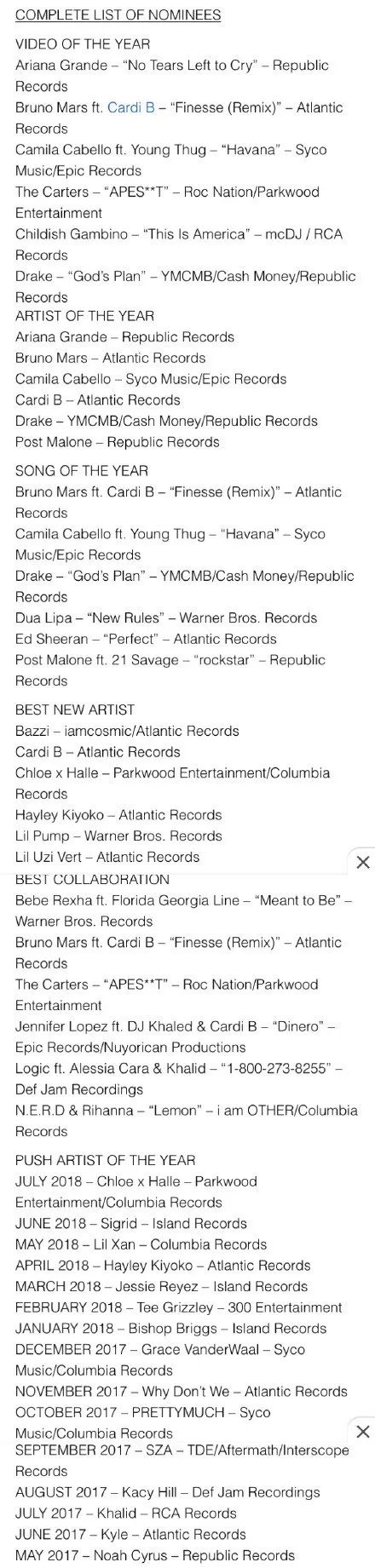 2018VMA(MTV音乐录影带大奖)提名名单出炉。Cardi B以十项提名领跑,The Carters斩获八项紧随其后,Drake和Childish Gambino七项提名,Bruno Mars获得六项,Ariana Grande和Camila Cabello分获五项提名。