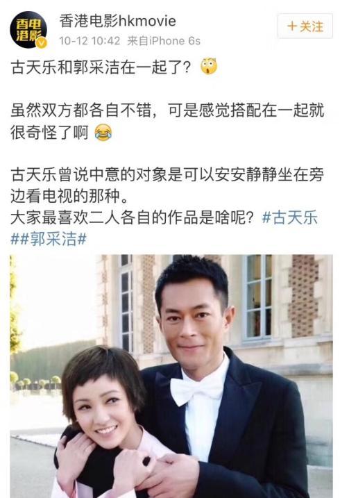 郭采洁能够和古天乐好了的话,真的可以说是捡到宝了,古天乐人品好又没有绯闻,大家肯定也觉得二人很般配吧?