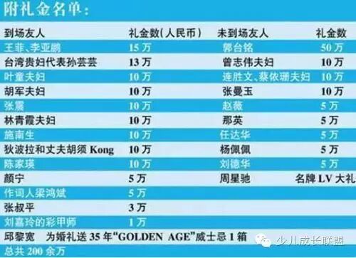 吴奇隆黄晓明杨幂周杰伦 明星婚礼随多少份子钱? 少儿成长联盟 港台男星 2016-05-28 10:25:28 242 创作不易,用心坚持,欢迎请BaGua喝几杯爱心咖啡!打赏并支持本文 打赏并删除本文 小虎队因吴奇隆大婚重聚,苏有朋、陈志朋充当伴郎,兄弟成功接得新娘刘诗诗,献唱当年组合名曲。日前苏有朋大谈对婚姻看法,笑指即使出席了兄弟的婚宴,但自己也未受气氛感染,自言没有想结婚的冲动。问到当日可有向奇隆封红包?有朋抵死地说:“我为什么要给他红包,想也没想过,他也不差这个吧!我们已经熟到压根,没想到要送礼跟包红包。”黄晓明baby梦幻婚礼豪请娱乐圈半壁江山大摆筵席。据悉教主准备了四个保险箱装礼金。黄晓明与Angelababy婚礼中2000名来宾各个都有头有脸,娱乐明星、商界大佬悉数到席,想必婚礼礼金肯定十分丰厚,不少网友对红包数目表示好奇!黄晓明:600多宾客参加婚礼,保守估计礼钱可达3000万,除了红包,林丹自曝送给了黄晓明一条自创品牌内裤,而杨子送的就是一串价值百万的千年至纯护法天珠王,极为罕见,市面价值100万元以上。人这么多红包礼品怎么收?教主婚礼现场摆放了4个保险箱,都是又深又厚的那种。陶晶莹:2005年陶晶莹结婚的时候,份子钱的行情还没有现在这么高,不过圈内的明星朋友们也随了超过100万元台币(约20万人民币)的份子钱。阿雅,孙燕姿,S.H.E,大小S等均随了1200人民币到6400人民币不等,其中吴宗宪一人就随了12万元台币(约2.4万人民币)。陶晶莹在爆料刘德华只送了她一套床单。“于是我每天就在床上滚,幻想刘德华和我躺在一起。”赵又廷高圆圆婚礼 高圆圆:高圆圆和赵又廷结婚时,宪哥不仅免费担任二位新人的婚礼主持人,连给的份子钱都涨到了300万元新台币(约合人民币60万元)。网传梁朝伟婚礼礼金 梁朝伟:梁朝伟和刘嘉玲在不丹举行婚礼的时候,网上曾盛传一份礼金名单。虽然这份名单的真实性有待证实,但少则几万,多则几十万的份子钱数额还是让人不得不惊叹:没个万把来块,都不好意思去参加人家的婚礼。杨幂:杨幂与刘恺威宣布婚期后,大幂幂的老搭档何晟铭透露,如果杨幂邀请他参加婚礼,他大概会包个1万元红包。结果杨幂在巴厘岛结婚时压根儿没邀请他。网友们最爱捅破窗户纸:一万块,连去巴厘岛的路费都不够。陶喆:陶喆与爱妻江姵蓉的婚礼现场动用了点钞机,最终收到了近600万礼金。原来点钞机不仅仅是纪委人员在使用。大S:大S与汪小菲在三亚结婚时,有消息称收到不少于910万的礼金,婆婆张兰也没有否认。有个小插曲,当初二人对外宣称要把婚礼所收礼金全部捐给日本地震灾区,后来出示的捐款发票却只有300万,面对记者的追问,婆婆张兰很生气:“怎么会不符呢?只多不少!天在看,不要再瞎说了。”周立波:相比汪小菲,周立波就更透明些,大婚后的翌日,就和新婚妻子胡洁出席海派清口公益专项基金揭牌仪式,将3200多万婚礼礼金全部捐出。谢娜:谢娜与张杰结婚时,更是有网友微博爆料婚礼收到的份子钱多达3700万:其中何炅170万元、吴奇隆300万元、吴昕20万元、杜海涛20万元、汪涵150万元、阿朵66万元、小沈阳120万元、赵本山600万元、喻恩泰80万元、魏晨50万元、王栎鑫18万元、张卫健70万元、蔡康永80万元、李维嘉56万元、杜汶泽50万元、苏有朋80万元、马伊琍19万元、龙丹妮90万元。范玮琪:张柏芝也曾送给新婚的范玮琪一张重达50公斤的大象造型座椅。因为大象是范玮琪最爱的动物,她在17岁时曾写过一首原创歌曲《粉红色的大象》。周杰伦:周杰伦结婚时更是不差钱,不仅提前宣布不要亲友礼金,还大方包了所有亲友的食宿机票。阅读更多精彩内容,请长按二维码关注我们哦~ 创作不易,用心坚持,欢迎请BaGua喝几杯爱心咖啡!打赏并支持本文 打赏并删除本文 感谢您的支持鼓励,我会继续努力的!文章地址:用户邮箱:打赏金额:USDT 请输入数字点击”去打赏“,即可进行打赏支持本文章哦 周杰伦 About the Author 少儿成长联盟 功能介绍:辽沈地区青少年教育交流开放式平台 Related Posts 袁弘张歆艺婚礼,刘诗诗大抢风头,杨幂却无辜躺枪 2016-06-11 08:39:40 邓超孙俪结婚纪念日,一家四口突然正经起来 2016-06-09 08:08:42 吴奇隆黄晓明杨幂周杰伦 明星婚礼随多少份子钱? 2016-05-28 10:25:28 Angelababy养猫不结扎惹争议? 2016-05-16 17:20:16 发表评论