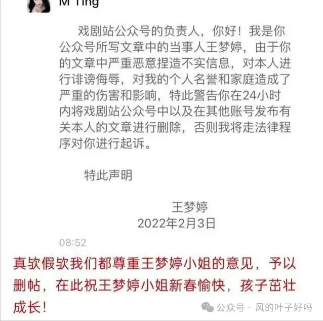 王梦婷见状也做出了回应,声称文章作者是在对她进行诽谤,要求删除文章。