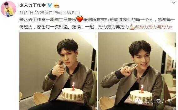 3月31日,张艺兴工作室官微更文,成立一周年。有文有图,更有美拍视频,让张艺兴陪你上班啊。
