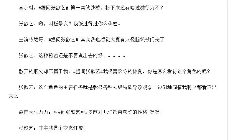 张歆艺在“林夏”时期确实吸了很多粉,包括微访谈中她说话的风格也都偏向“大大咧咧”,比如有人问她你怎么看待这个角色,她就说“这个角色的主要任务就是彰显各种神经特质导致观众一边倒地同情我”。