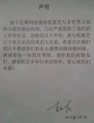 而在七年之痒的时间节点上,两人的感情遭遇了危机。王志飞于2012年3月发布了声明,宣布与张歆艺分手。
