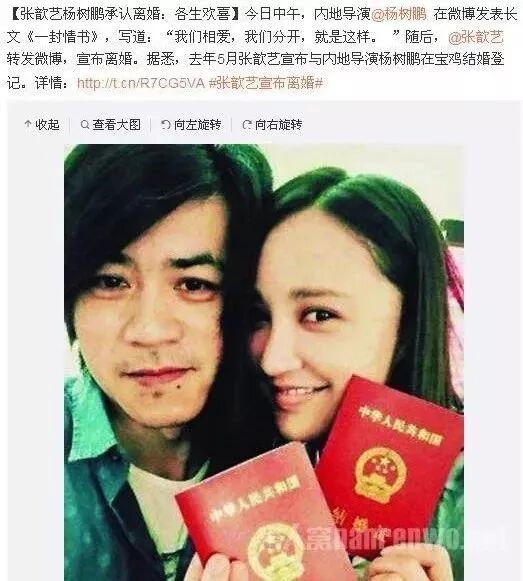 但他们两人的婚姻只维持了一年就以失败告终。2014年10月29日晚,有网友爆料张歆艺和杨树鹏办理了离婚手续。