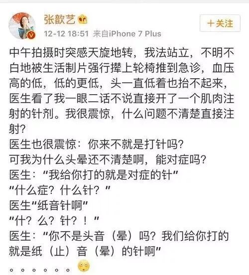 另外,她还曾发微博diss过医生。因为拍摄时头晕在被送到医院后医生直接为她开了注射剂,她质疑道:“什么问题不清楚直接注射?”