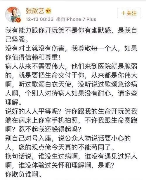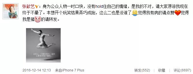 此后,因为遭到了太多网友的反对,张歆艺不得不发了新微博为自己的心直口快道歉,说自己“本想开个玩笑结果弄巧成拙”。